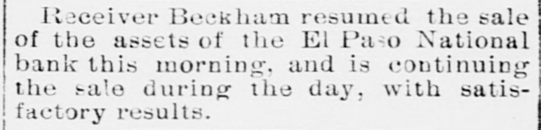 Receiver Beckham resumed the sale of the assets of the El Paso National bank this morning, and is continuing the sale during the day, with satisfactory results.