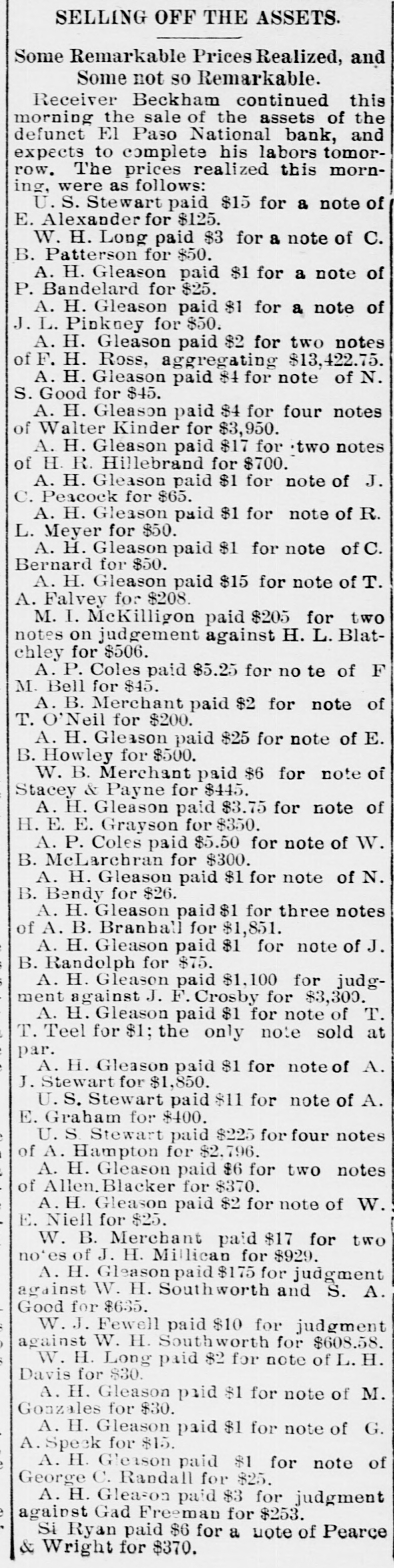 SELLING OFF THE ASSETS. Some Remarkable Prices Realized, and Some not SO Remarkable. Receiver Beckham continued this morning the sale of the assets of the defunct Fl Paso National bank, and expects to complete his labors tomorrow. The prices realized this morning, were as follows: U. S. Stewart paid $15 for a note of E. Alexander for $125. W. H. Long paid $3 for a note of C. B. Patterson for $50. A. H. Gleason paid $1 for a note of P. Bandelard for $25. A. H. Gleason paid $1 for a note of J. L. Pinkney for $50. A. H. Gleason paid $2 for two notes of F. H. Ross, aggregating $13,422.75. A. H. Gleason paid $4 for note of N. S. Good for $45. A. H. Gleason paid $4 for four notes of Walter Kinder for $3,950. A. H. Gleason paid $17 for two notes of H. R. Hillebrand for $700. A. H. Gleason paid $1 for note of J. C. Peacock for $65. A. H. Gleason paid $1 for note of R. L. Meyer for $50. A. H. Gleason paid $1 for note of C. Bernard for $50. A. H. Gleason paid $15 for note of T. A. Falvey for $208. M. I. McKilligon paid $205 for two notes on judgement against H. L. Blatchley for $506. A. P. Coles paid $5.25 for no te of F M. Bell for $45. A. B. Merchant paid $2 for note of T. O'Neil for $200. A. H. Gleason paid $25 for note of E. B. Howley for $500. W. B. Merchant paid $6 for note of Stacey & Payne for $445. A. H. Gleason paid $3.75 for note of H. E. E. Grayson for $350. A. P. Coles paid $5.50 for note of W. B. McLarchran for $300. A. H. Gleason paid $1 for note of N. B. Bendy for $26. A. H. Gleason paid $1 for three notes of A. B. Branball for $1,851. A. H. Gleason paid $1 for note of J. B. Randolph for $75. A. H. Gleason paid $1,100 for judgment against J. F. Crosby for $3,300. A. H. Gleason paid $1 for note of T. T. Teel for $1; the only note sold at par. A. H. Gleason paid $1 for note of A. J. Stewart for $1,850. S. Stewart paid $11 for note of A. E. Graham for $400. U. S. Stewart paid $225 for four notes of A. Hampton for $2.796. A. H. Gleason paid $6 for two notes of Allen, Blacker for $370. A. H. Gleason paid $2 for note of W. E. Niell for $25. W. B. Merchant paid $17 for two notes of J. H. Millican for $929. A. H. Gleason paid $175 for judgment against W. H. Southworth and S. A. Good for $635. W. J. Fewell paid $10 for judgment against W. H. Southworth for $608.58. W. H. Long paid $2 for note of L.H. Davis for $30. A. H. Gleason paid $1 for note of M. Gonzales for $30. A. H. Gleason paid $1 for note of G. A. Speek for $15. A. H. Gleason paid $1 for note of George C. Randall for $25. A. H. Gleason paid $3 for judgment against Gad Freeman for $253. Si Ryan paid $6 for a note of Pearce & Wright for $370.