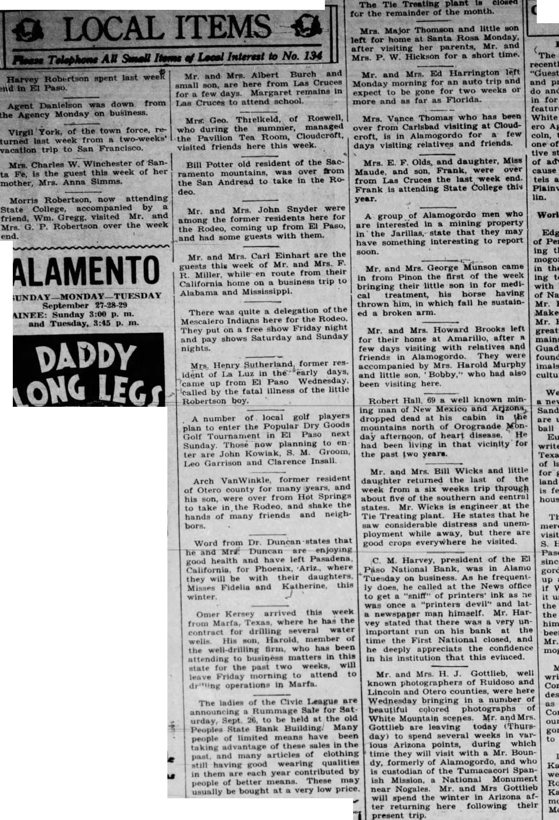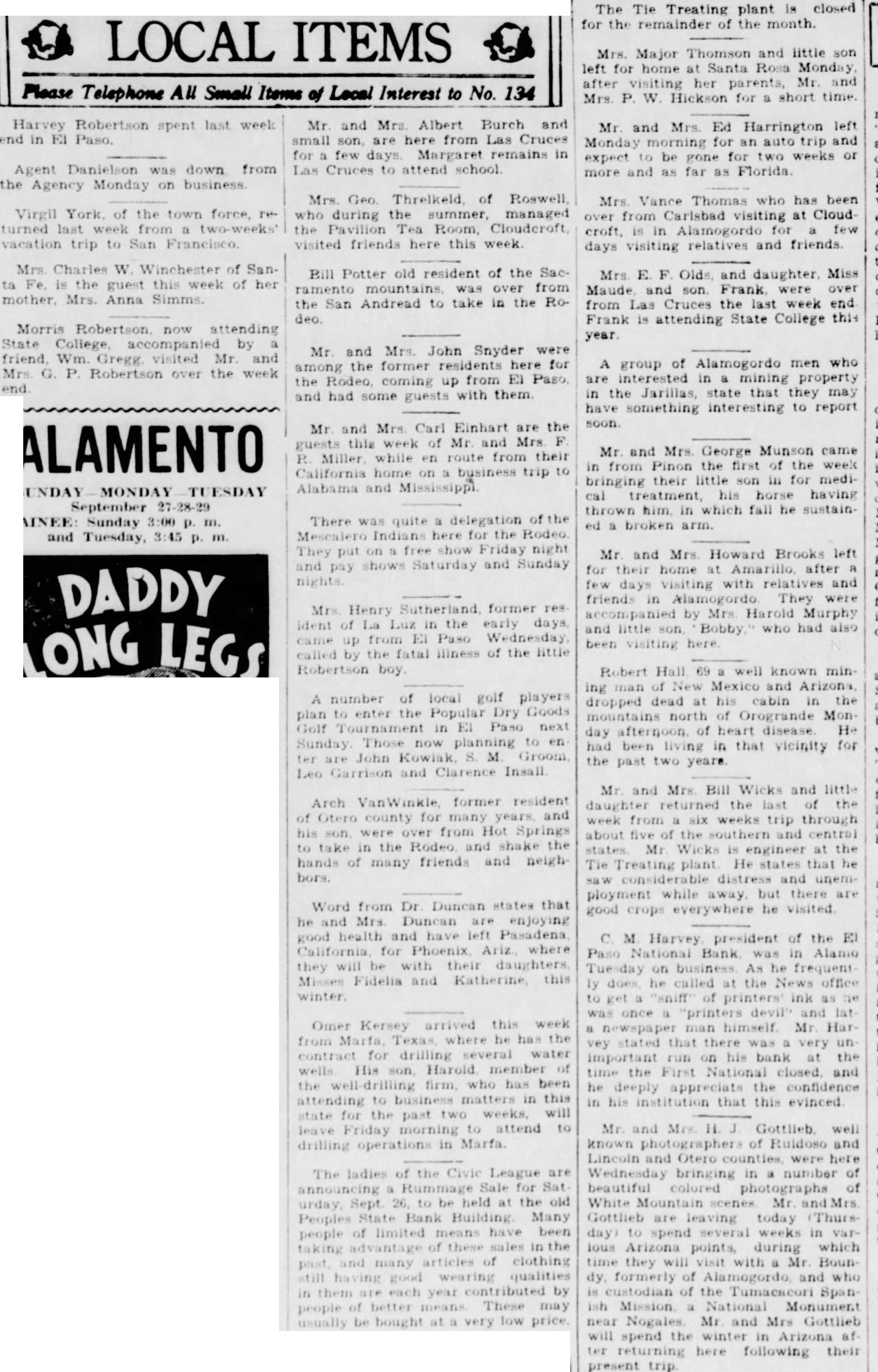 LOCAL ITEMS Please Telephone All Small Items of Local Interest to No. 134 Harvey Robertson spent last week end in EI Paso Agent Danielson was down from the Agency Monday on business. Virgil York, of the town force, returned last week from two-weeks' vacation trip to San Francisco. Mrs. Charles W. Winchester of Santa Fe, is the guest this week of her mother, Mrs. Anna Simms. Morris Robertson, now attending State College, accompanied by friend, Wm. Gregg, visited Mr. and Mrs. G. P. Robertson over the week end. Mr. and Mrs. Albert Burch and small son, are here from Las Cruces for few days. Margaret remains in Las Cruces to attend school. Mrs. Geo. Threlkeld, of Roswell, who during the summer, managed the Pavilion Tea Room, Cloudcroft, visited friends here this week. Bill Potter old resident of the Sacmountains, was over from the San Andread to take in the Rodeo. Mr. and Mrs. John Snyder were among the former residents here for the Rodeo, coming up from El Paso, and had some guests with them. Mr. and Mrs. Carl Einhart are the guests this week of Mr. and Mrs. F. R. Miller, while en route from their California home on a business trip to Alabama and Mississippi. There was quite a delegation of the Mescalero Indians here for the Rodeo. They put on a free show Friday night and pay shows Saturday and Sunday nights. Mrs. Henry Sutherland, former resident of La Luz in the early days, came up from El Paso Wednesday, called the fatal illness of the little Robertson boy. A number of local golf players plan to enter the Popular Dry Goods Golf Tournament in El Paso next Sunday Those now planning to en ter are John Kowiak, S. M. Groom, Leo Garrison and Clarence Insall. Arch VanWinkle, former resident of Otero county for many years, and his son, were over from Hot Springs to take in the Rodeo, and shake the hands of many friends and neighbors. Word from Dr. Duncan states that he and Mrs. Duncan are enjoying good health and have left Pasadena, California, for Phoenix, Ariz., where they will be with their daughters, Misses Fidelia and Katherine, this Omer Kersey arrived this week from Marfa, Texas, where he has the contract for drilling several water wells His son, Harold, member of the well-drilling firm, who has been attending to business matters in this state for the past two weeks, will leave Friday morning to attend to drilling operations in Marfa. The ladies of the Civie League are announcing Rummage Sale for Saturday, Sept. 26, to be held at the old Peoples State Bank Building. Many people of limited means have been taking advantage of these sales in the past, and many articles of clothing still having good wearing qualities in them are each year contributed by people of better means. These may usually be bought at a very low price. The Tie Treating plant is closed for the remainder of the month. Mrs. Major Thomson and little son left for home at Santa Rosa Monday, after visiting her parents, Mr. and Mrs. P. W. Hickson for a short time. Mr. and Mrs. Ed Harrington left Monday morning for an auto trip and expect to be gone for two weeks or more and as far as Florida. Mrs. Vance Thomas who has been over from Carlsbad visiting at Cloudcroft, is in Alamogordo for few days visiting relatives and friends. Mrs. E. F. Olds, and daughter, Miss Maude, and son, Frank, were over from Las Cruces last week end. Frank is attending State College this year. A group of Alamogordo men who are interested in mining property in the Jarillas, state that they may have something interesting to report soon. Mr. and Mrs. George Munson came in from Pinon the first of the week bringing their little son in for medical treatment, his horse having thrown him, in which fall he sustained a broken arm. Mr. and Mrs. Howard Brooks left for their home at Amarillo, after few days visiting with relatives and friends in Alamogordo. They were accompanied by Mrs. Harold Murphy and little son, Bobby,' who had also been visiting here. Robert Hall 69 well known mining man of New Mexico and Arjzona, dropped dead at his cabin in the mountains north of Orogrande Monday afternoon, of heart disease, He had been living in that vicinity for the past two years. Mr. and Mrs. Bill Wicks and little daughter returned the last of the week from six weeks trip through about five of the southern and eentral states. Mr. Wicks is engineer at the Tie Treating plant. He states that he saw considerable distress and unemployment while away, but there are good crops everywhere he visited. C. M. Harvey, president of the El Paso National Bank, was in Alamo Tuesday on business. As he frequently does, he called at the News office to get "sniff" of printers' ink as he was once a "printers devil" and lata newspaper man himself. Mr. Harvey stated that there was very un important run on his bank at the time the First National closed, and he deeply appreciats the confidence in his institution that this evinced. Mr. and Mrs. H. J. Gottlieb, well known photographers of Ruidoso and Lincoln and Otero counties, were here Wednesday bringing in a number of beautiful colored photographs of White Mountain scepes. Mr. and Mrs. Gottlieb are leaving today (Thursday) to spend several weeks in various Arizona points, during which time they will visit with a Mr. Boundy, formerly of Alamogordo, and who is custodian of the Tumacacori Spanish Mission, a National Monument near Nogales. Mr. and Mrs Gottlieb will spend the winter in Arizona after returning here following their present trip.
