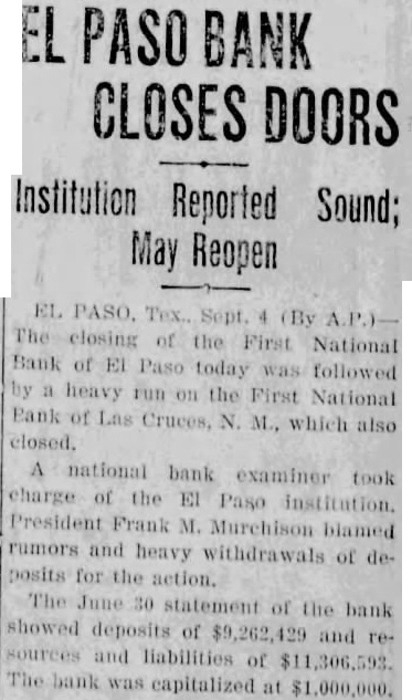 EL PASO, Txas, Sept. The closing the First National Bank of Paso today was lowed by heavy the First National Bank of Cruces, N, which examiner took charge President Frank blamed rumors and heavy deposits for The June statement of the bank showed of and liabilities bank ized $1,000,000. McSain, the Las run started about after Paso received. condition and would reopen few days.