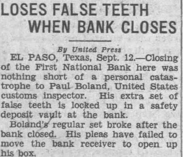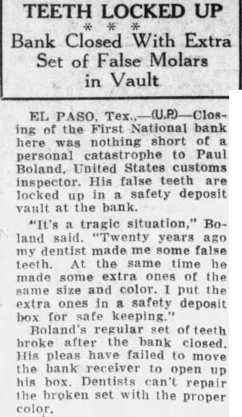 EL PASO. Tex. ing of the First National bank here was nothing short of personal catastrophe to Paul Boland, United States customs inspector. His false teeth are locked up in safety deposit vault at the bank. "It's tragic situation," Boland said. "Twenty years ago my dentist made me some false teeth. At the same time he made some extra of the same size and color. put the extra ones in safety deposit box for safe keeping." Boland's regular set of teeth broke after the bank closed. His pleas have failed to move the bank receiver to open up his box. Dentists can't repair the broken set with the proper color.
