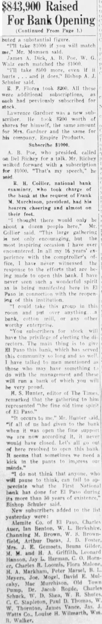 R. H. Collier. national bank examiner, who took charge of the bank at the request of Frank M. Murchison, president, had his hearers cheering and almost on their thought there would only be about dozen people here," Mr. Collier said "This large gathering is not only encouraging, but the most inspiring occasion have ever encountered. In all my 16 years' ex perience with the comptroller's office, have never witnessed the response to the efforts that are being made to open this bank have never seen such wonderful spirit as is being manifested here in El Paso in with the reopen ing of this institution. could take this group in this room and put anything bank, cotton or any other worthy enterprise. "You subscribers for stock will have the privilege of electing the directors. The main thing is to give EI Paso this bank, which has served this community long and so well have talked to men mentioned as those who may have something do with the management and these will run bank of which you will be very proud. H. Hunter, editor of The Times remarked that the gathering to him represented "the fine old time spirit of El Paso." "It occurs to me Mr. Hunter aid "if all of US had given to the bank when it was open the fine support We are now according it. it never would have closed. Let's all go out of here resolved to open this bank It seems that sometimes we need kick in the pants to impress our minds." "I do not think that anyone. who will pause to think, can fail to appreciate what the First National bank has done for El Paso during its more than 50 years of existence," Bishop Schuler said. New subscribers added to the list yesterday were: Alemite Co. of EI Paso, Charles Auer, Ian Benton. W. Berkshire, Channing M. Brown, W. 8. Brownfield, Arthur Dueas, D. Foster. Mrs. J. E. Gemoets. Beuna Gilder. M. M. and H. Griffith. Leonard Hanson, Jay Harman, C. O. Horner, Charles R. Loomis, Flora Malone, H. A. Markham, Peter Marsel, B. Meyers, Joe, Mogel, David E. Mulcaby, Mac Murchison. Old Town Pump, Dr. Jacob Rogde, Charles Schuck. W. D. Shea, W R. Shutes. C. Stapleton, Paul D. Thomas, W W. Thornton, James Vance. Jas. Watts Co., Louise H. Wilmarth, Win R. Walker,