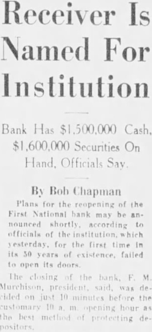 By Bob Chapman Plans for the reopening of the First National bank may be nounced shortly according officials of yesterday. for the first time in its 30 years of existence, failed to open its doors