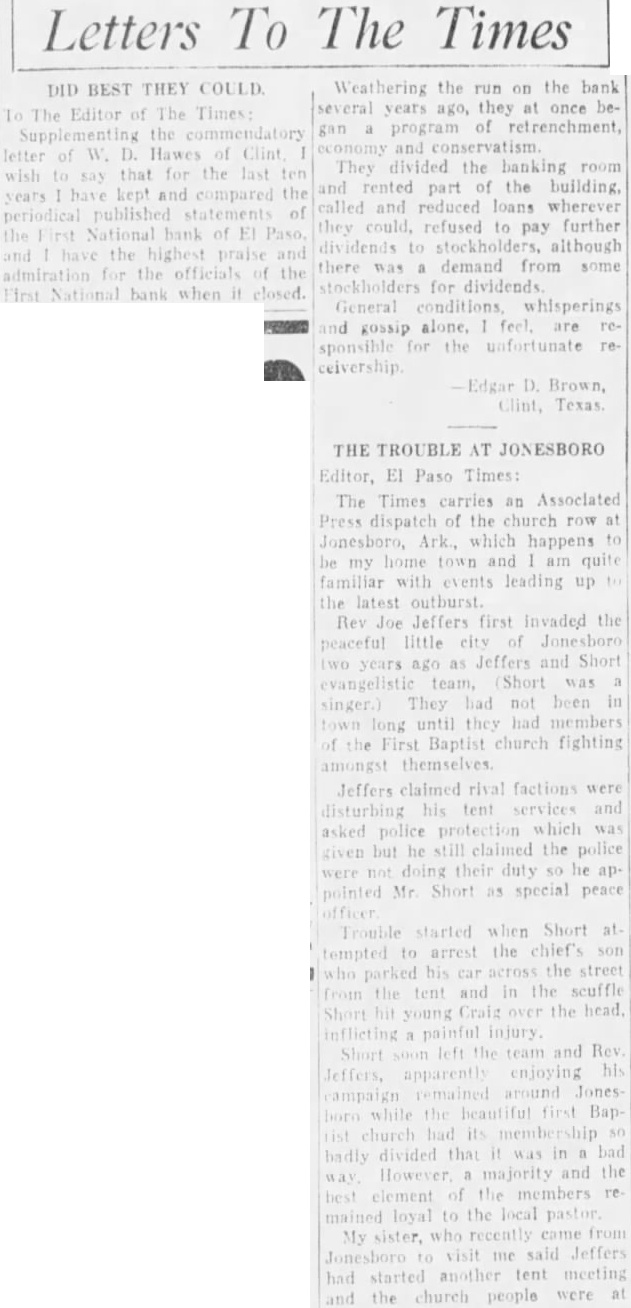 THE TROUBLE AT JONESBORO Editor, El Paso Times The Times carries an Associated Press dispatch of the church row at Jonesboro, Ark., which happens my home town and am quite familiar with events leading up the latest outburst. Rev Joe Jeffers first invaded the peaceful little city of Jonesboro two years ago as Jeffers and Short evangelistic team, Short was They had not been in long until they had members First Baptist church fighting amongst themselves Jeffers claimed rival factions were disturbing his tent services and asked police protection which was given but he still claimed the police not doing their duty so he pointed Mr. Short as special peace Trouble started when Short at tempted to arrest the chief's son parked his car across the street from the tent and in the scuffle Short hit young Craig over the head. inflicting painful injury Short left the team and Rev Jeffers, apparently enjoying his campaign around Jones born while the beautiful first Baprist church had its membership divided that it was in bad However majority and the element of the members re mained loyal to the local pastor My sister, who came Jonesboro visit me said Jeffers had started another tent meeting and the church people were at