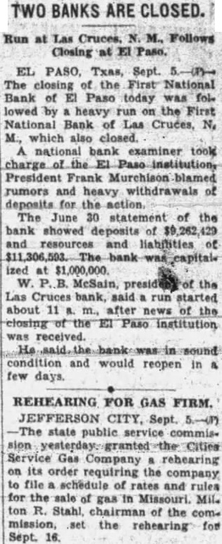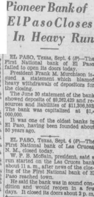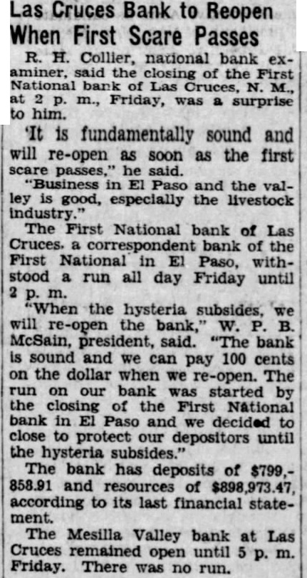 'It is fundamentally sound and will re-open as soon as the first scare passes," he said. 'Business in Paso and the valley is good, especially the livestock industry The First National bank of Las Cruces. bank of the First National in El Paso, withstood a run all day Friday until 2 m. "When the hysteria subsides, we will re-open bank,' W. P. McSain, president, said. "The bank is sound and we can pay 100 cents on the dollar when we re-open. The run on our bank was started by the closing of the First National bank in El Paso and we decided to close to protect our depositors until the hysteria subsides. bank has deposits of $799.858.91 and of $898,973.47 according to its last financial statement. The Mesilla Valley bank at Las Cruces open m. Friday. There was no run.