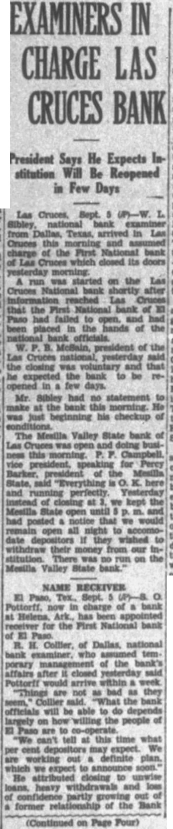 Las Sept. Sibley, bank from Dallas, Texas. arrived in Cruces this morning and charge of the First National bank of Las Cruces which closed its doors run was started on the Las Cruces National bank shortly after reached Las Cruces that the First National bank of had failed to open. and had been placed in the hands of the president of the Cruces national, yesterday said the closing was voluntary and that he expected the bank to opened in few Mr. had no statement make at the bank morning. was just beginning his checkup of The Mesilla Valley State bank of Las Cruces open doing busithis morning. vice speaking for Percy Barker. of the Mesilla State, said "Everything is K. here and running perfectly. Yesterday instead of closing at we kept the Mesilla State open until m. and had posted notice that we would remain open all night to accomodate depositors If they wished to withdraw their money from our institution. There was no run on the Menilla Valley State bank."