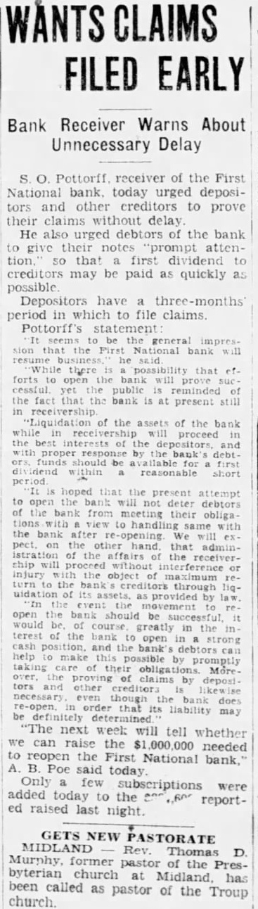 S. O. Pottorff receiver of the First National bank. today urged depositors and other creditors to prove their claims without delay He also urged debtors of the bank to give their notes "prompt attention so that first dividend to creditors may be paid as quickly as possible Depositors have three-months period in which to file claims. Pottorff's statement National forts reminded the fact that the bank at present still Liquidation of the assets of the bank will best the bank short hoped the deter debtors the bank from meeting their obliga to handling same the will pect the that affairs the or injury of through open the successful would course greatly the terest and the bank debtors help make this taking obligations claims tors necessary does order that liability may "The next week will tell whether can raise the needed to reopen the First National bank, B. Poe said today Only few subscriptions were added today the to reported raised last night