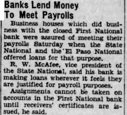 Business houses which did business with the closed First National bank were assured of meeting their payrolls Saturday when the State National and the El Paso National offered loans for that purpose. R. W. McAfee, vice president of the State National. said his bank is making loans wherever it feels they are justified for payroll purposes. Assignments cannot be taken on accounts in the First National bank until receivers' certificates are issued, he said.