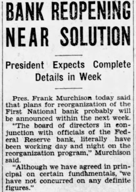 Pres. Frank Murchison today said that plans for reorganization of the First National bank probably will be announced within the next week. "The board of directors in conjunction with officials of the Federal Reserve bank, literally have been working day and night on the reorganization program,' Murchison said. "Although we have agreed in principal on certain fundamentals, "we have not concurred on any definite figures.