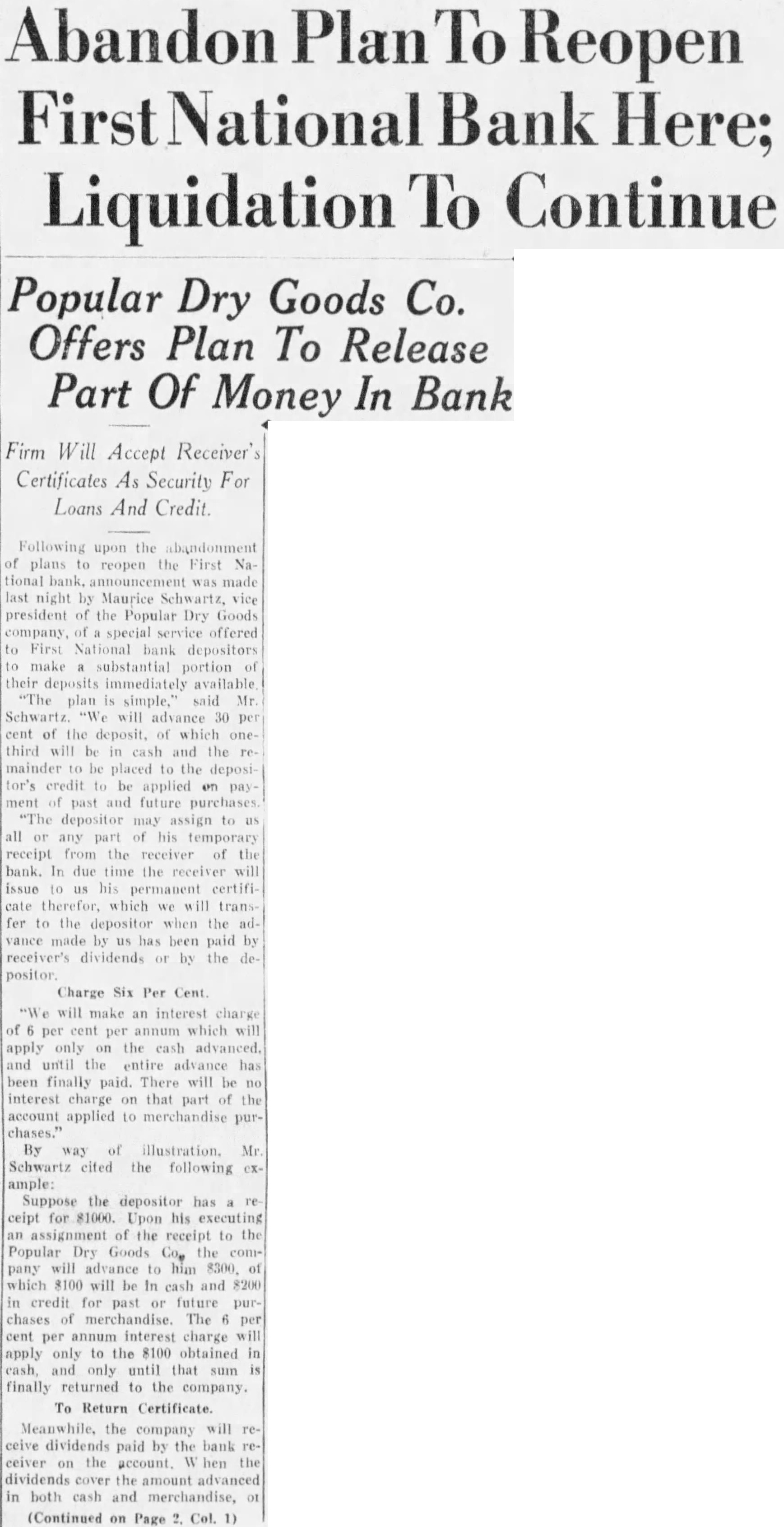 Following upon the abandonment plans reopen the First National made last night by Maurice Schwartz, vice president of the Popular Dry Goods company, special offered to First National depositors make substantial portion their deposits immediately available plan said Mr. Schwartz. will advance 30 cent of the deposit, which third will cash and the mainder placed to the deposicredit be applied ment past and future purchases. depositor may assign to all any his temporary receipt from the receiver of the bank. due time the receiver will issue his permanent certifitherefor, which will fer to the depositor when the made by us has been paid receiver's dividends by the positor.