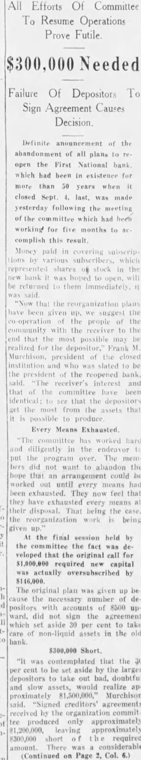Every Means Exhausted. committee has worked diligently in the endeavor the program The bers did not want to abandon the that an arrangement could worked out until every means had exhausted. They now feel that they have exhausted every means their disposal. That being the the reorganization work being given the final session held by the committee the fact veloped that the original call for $1,000,000 required new capital was actually oversubscribed by The original plan was given the necessary number positors with accounts of 8500 ward, did not sign the agreement which set aside 30 per cent to take of non-liquid assets in the old bank.