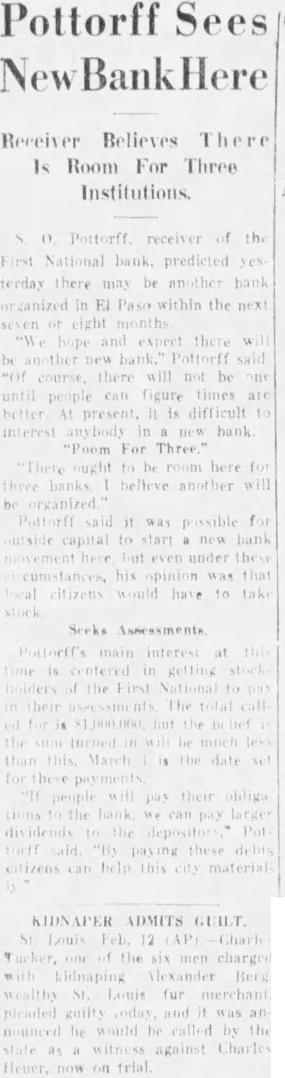 0. Pottorff. receiver of the First National bank. predicted terday there may be bank organized in El Paso within the next seven eight months expect there be another bank," Pottorff "Of course, there will not be until figure times are better present, is difficult interest new bank "Foom For Three." There ought room here three banks believe another be Pottorff said it was possible outside capital to start new but even the cumstances, his opinion was that citizens would have to take stock