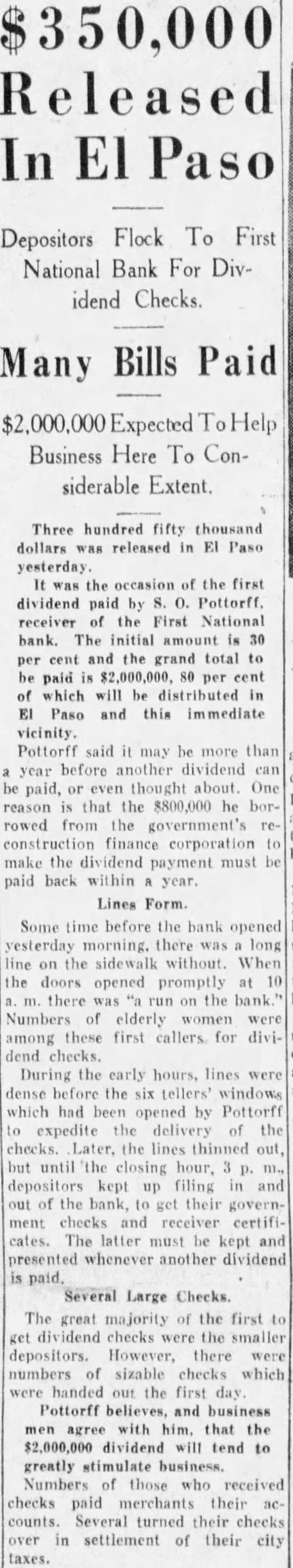 Three hundred fifty thousand dollars released the occasion of the first dividend paid by Pottorff. receiver of the First National bank. The initial amount cent and the grand total to paid $2,000,000, per cent which will be distributed in Paso and this immediate Pottorff said may be than year before another dividend paid, thought about One reason that the $800,000 he rowed from the government's construction finance corporation make the dividend payment must paid back within year.