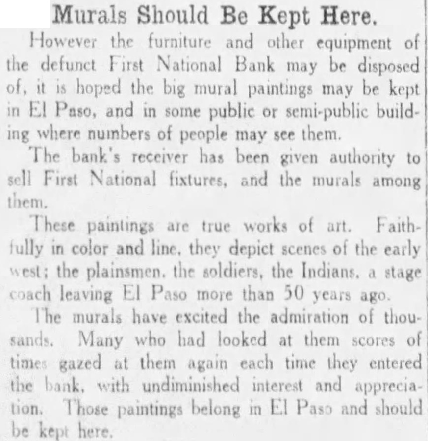 However the furniture and other of equipment the defunct National Bank may be disposed of, is hoped the big mural paintings may be kept Paso, and in some public or semi-public buildwhere numbers of people may see them The bank's receiver has been given authority to First National fixtures, and the murals among them. These paintings are true works of art. Faithfully in color and line. they depict scenes of the early the plainsmen. the soldiers, the Indians. stage coach leaving El Paso more than 50 years ago. The murals have excited the admiration thou sands. Many who had looked them scores times gazed at them again each time they entered the bank. with undiminished interest and tion. Those belong in Paso and should paintings be kept here.