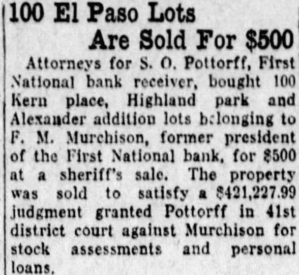 100 El Paso Lots Are Sold For $500 Attorneys for S. 0. Pottorff, First National bank receiver, bought 100 Kern place, Highland park and Alexander addition lots belonging to M. Murchison, former president of the First National bank, for 8500 at a sheriff's sale. The property was sold to satisfy $421,227.99 judgment granted Pottorff in 41st district court against Murchison for stock assessments and personal loans.