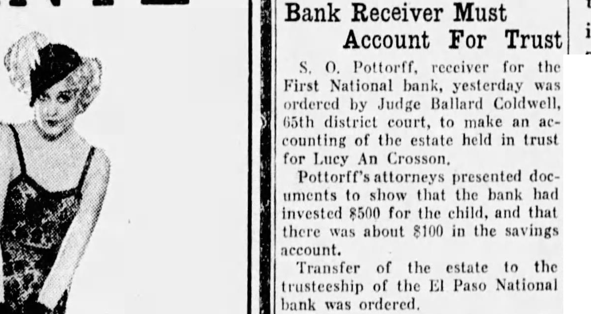 S. O. Pottorff. receiver for the First National bank, yesterday was ordered by Judge Ballard Coldwell, 65th district court, to make an accounting of the estate held in trust for Lucy An Crosson. Pottorff's attorneys presented documents to show that the bank had invested 8500 for the child, and that there was about 8100 in the savings account. Transfer of the estate to the trusteeship of the EI Paso National bank was ordered.