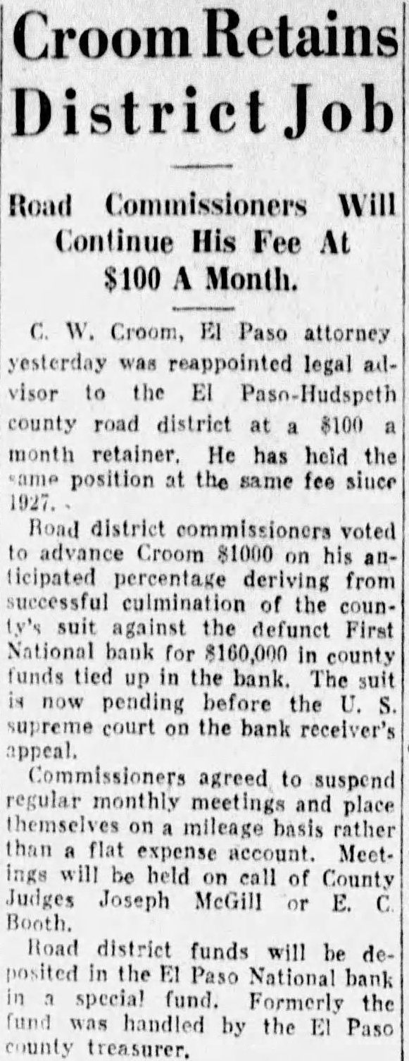 C. W. Croom, El Paso attorney yesterday was reappointed legal advisor to the EI Paso-Hudspeth county road district at a 8100 month retainer. He has held the same position at the same fee since 1927. Road district commissioners voted to advance Croom $1000 on his alllicipated percentage deriving from successful culmination of the county's suit against the defunct First National bank for $160,000 in county funds tied up in the bank. The suit is now pending before the U. S. supreme court on the bank receiver's appeal. Commissioners agreed to suspend regular monthly meetings and place themselves on mileage basis rather than flat expense account. Meetings will be held on call of County Judges Joseph McGill or E. C. Booth. Road district funds will be deposited in the El Paso National bank in special fund. Formerly the fund was handled by the El Paso county treasurer.
