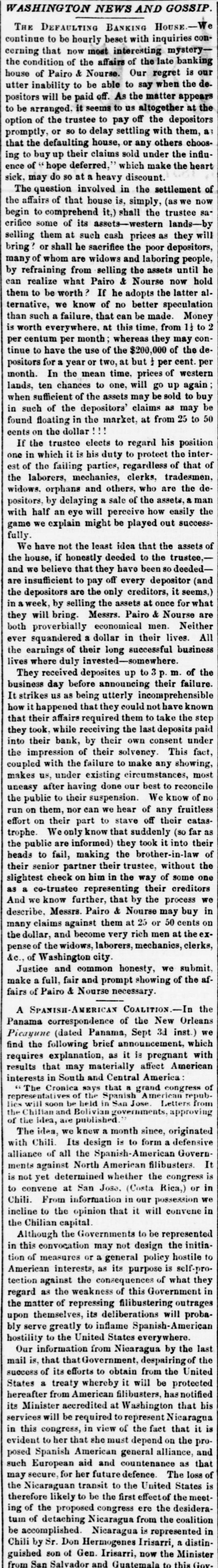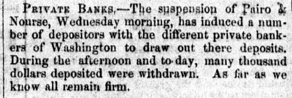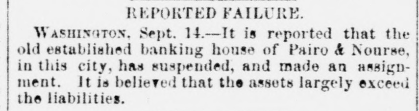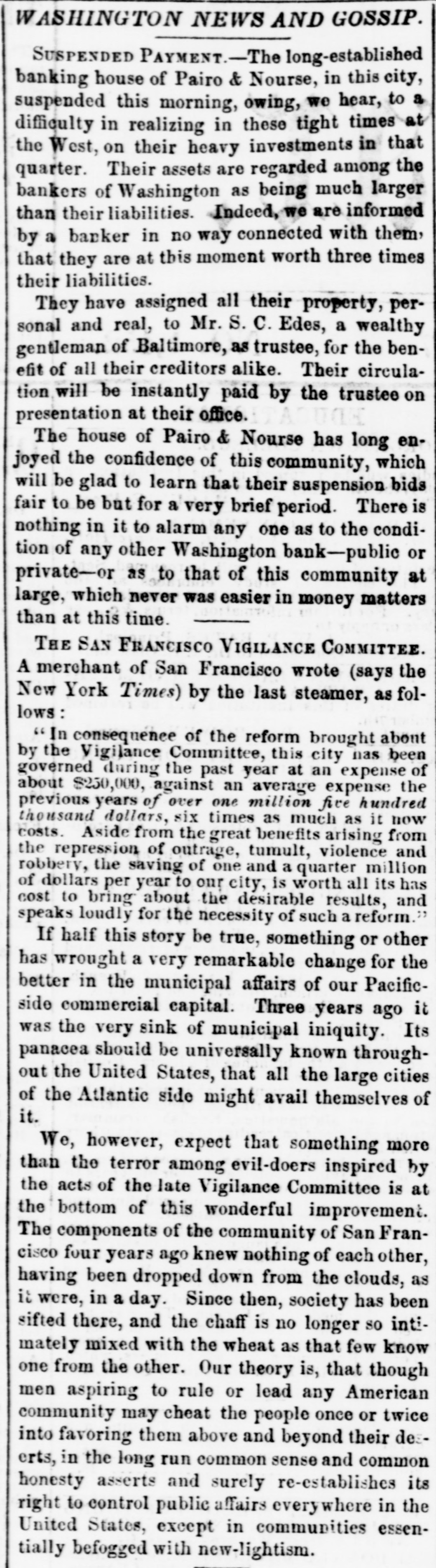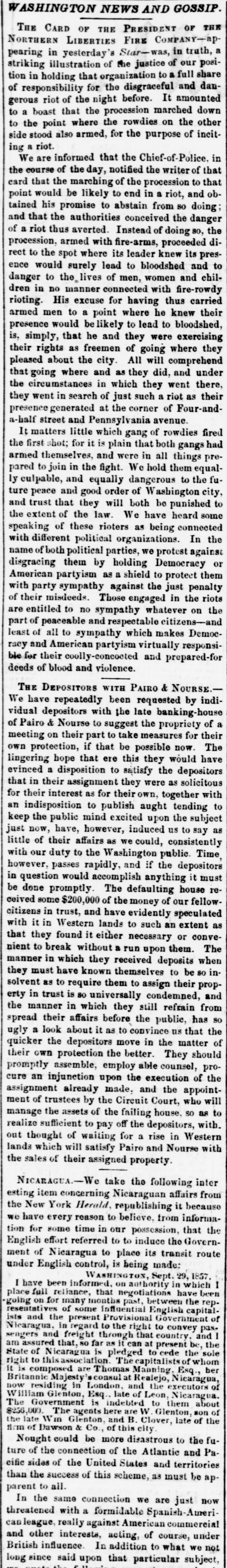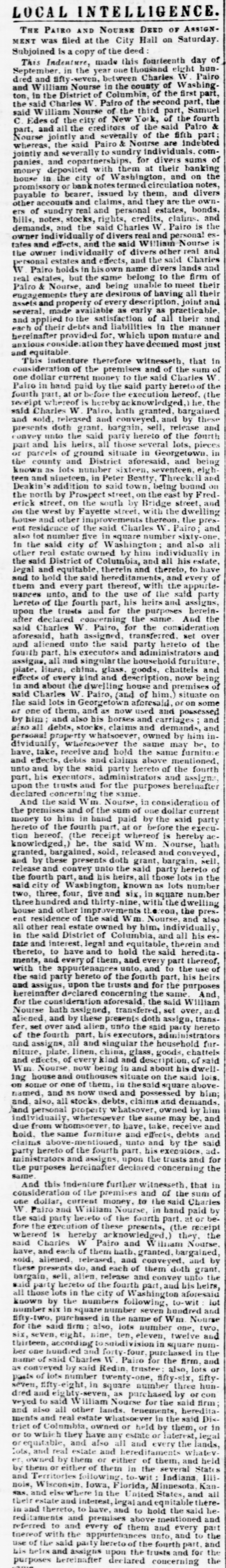LOCAL INTELLIGENCE. THE PAIRO AND NOURSE DEED OF ASSIGNMENT was filed at the City Hall on Saturday. Subjoined is a copy of the deed This Indenture, made this fourteenth day of September. in the year one thousand eight hundred and fifty seven, between Charles W Pairo and William Nourse in the county of Washington, in the District of Columbia, of the first part, the said Charles W. Pairo of the second part, the said William Nourse of the third part, Samuel C. Edes of the city of New York, of the fourth part, and all the creditors of the said Pairo & Nourse jointly and severally of the fifth part; whereas, the said Pairo & Nourse are indebted jointly and severally to sundry individuals. companies, and copartnerships, for divers sums of money deposited with them at their banking house in the city of Washington, and on the promissory or banknotes termed circulation notes, payable to bearer, issued by them, and divers other accounts and claims, and they are the owners of sundry real and personal estates, bonds, bills, notes, stocks, rights, credits, claims. and demands, and the said Charles W. Pairo is the owner individually of divers real and personal estates and effects, and the said William Nourse is the owner individually of divers other real and personal estates and effects, and the said Charles W Pairo holds in name divers lands and real estates, but the same belong to the firm of Pairo & Nourse, and being unable to meet their engagements they are desirous of having all their assets and property of every description, joint and several, made available as early as practicable and applied to the satisfaction of all their and each of their debts and liabilities in the manner hereinafter provided for, which upon mature and anxious consideration they have deemed most just and equitable This indenture therefore witnesseth that in consideration of the premises and of the sum of one dollar current money to the said Charles W Pairo in hand paid by the said party hereto of the fourth part, at or fore the execution hereof. (the receipt whereof is hereby ae knowledged, he, the said Charles W. Pairo, hath granted, bargained and sold, released and conveyed, and by these presents doth grant. bargain, sell, release and convey unto the said party hereto of the fourth part and his heirs, all those several lots, pieces or parcels of ground situate in Georgetown, in the county and District aforesaid, and being known as lots number sixteen, seventeen. eigh. teen and nineteen, in Peter Beatty, Threckell and Deakin addition to said town, being bound on the north by Prospect street, on the east by Frederick street, on the south by Bridge street, and on the west by Fayette street, with the dwelling house and other improvements thereon, the present residence of the said Charles W. Pairo; and also lot number five in square number sixty-one. in the said city of ashington and also all other real estate owned by him individually in the said District of Columbia, and all his estate, legal and equitable, therein and thereto, to have and to hold the said hereditaments, and every of them and every part thereof, with the appurtenances unto, and to the use of the said party hereto of the fourth part, his heirs and assigns, upon the trusts and for the purposes hereinafter declared concerning the same. And the said Charles W. Pairo, for the consideration aforesaid, bath assigned, transferred. set over and aliened unto the said party hereto of the fourth part, his executors and administrators and assigns, all and singular the household furniture, plate, Huen, china, glass, goods, chattels and effects of every kind and description, now being in and about the dwelling house and premises of said Charles W Pairo, (and of him.) situate on the said lots in Georgetown aforesaid, or on some or one of them, and as now used and possessed by him and also his horses and carriages and also all debts, stocks, claims and demands, and personal property hatsoever, owned by him individually, wheresoever the same may be, to have, take, receive and hold the same furniture and effects, debts and claims above mentioned, unto and by the said party hereto of the fourth part, his executors. administrators and assigns, upon the trusts and for the purposes bereinafter declared concerning the same. And the said Wm. Nourse, in consideration of the premises and of the sum of one dollar current money to him in hand paid by the said party hereto of the fourth part, at or before the execution hereof, (the receipt whereof is hereby acknowledged,) he. the said Wm. Nourse, hath granted, bargained, sold, released and conveyed, and by these presents doth grant, bargain, sell, release and convey unto the said party hereto of the fourth part, and his heirs, all those lots in the said city of Wasbington, known as lots number two, three, four, five and six, in square number three hundred and thirty-nine, with the dwelling house and other improvements the reon, the pres. ent residence of the said Wm. Nourse, and also all other real estate owned by him. individually, in the said District of Columbia, and all his estate and interest, legal and equitable, therein and thereto, to have and to hold the said hereditaments, and every of them, and every part thereof, with the appurtenances unto. and to the use of the said party hereto of the fourth part, his heirs and assigns, upon the trusts and for the purposes hereinafter declared concerning the same And, for the consideration aforesaid the said William Nourse bath assigned, transfered, set over, and aliened, and by these presents doth assign, transfer. set over and alien, unto the said party hereto of the fourth part, his executors, administrators and assigns, all and singular the household furniture, plate. linen, china, glass, goods, chattels and effects, of every kind and description, of said Wm. Nourse now being in and about his dwelling house and outhouses situate on the said lois. on some or one of them, in thesaid sq