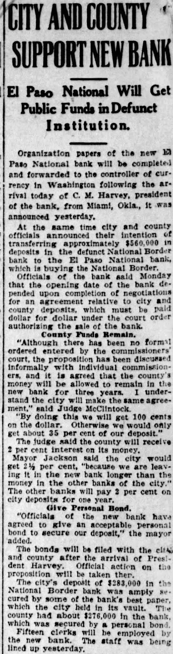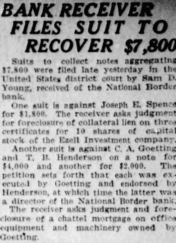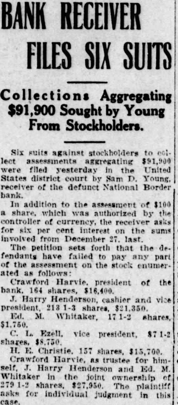 Charges that county school authorities are trying cover up their negligence in their failure to discover fund shortages in the National Border bank mude yesterday by James A. Bordets president of the American Trust & Savings In statement Borders put the blame on school authorities for the present condition of affairs. His statement is the first open made against county authorischool superintendent. has consistently and continues to deny that any blame attaches her office failure to discover the shortages sooner. Border's statement follows: "The people should know that there may be an inducement for the many statements and all the dissussion that has taken place about the $58,000 item, in the fact that the school authorities negligently discover that shortage in the National Border bank and negligentfailed to file any claim against the receiver of that bank, and the statute has now run out on this claim against the "This has placed the school au thorities most embarrassing situation and they are now turning in every direction to extricate themselves and to cover up their negligence. Evidently they seem to feel that their remaining hope in that connection is to lasten liability upon the American Trust & Savings bank this $58,000 "Fortunately, there is record and other indisputable evidence to tablish that this money misaplong before the American Trust & Savings bank was named as depository and also to establish that this money was never in fact in the American bank. The state attditor has found that this money misappropriated years before, the defalcations starting six or seven years "Miss ago. Huggett has strenuously insisted that was no part her duty to make transfer of the school funds from one depository to other If this is true then why did she, within the last month, transfer the balance of the school funds in the American Trust & Savings bank. $20,038.95. to the State National bank, the new depository The pertinent question now is why the school authorities did not discover the shortage in the school fund in the National Border bank. which the state auditor has found started six seven years ago, and. particularly. why, after they discovered this shortage, they have not to this day taken any action whatsoever to recover these funds? The American Trust & Savings bank of the school funds from September 1923, the date fixed by the state auditor. Let the audit proceed. new question was Injected into the controversy yesterday. It in. volves the manipulations of Harry Henderson, who, purp rted statement, admits he got the missing 857,000. Miss Huggett says that warrants held by the National Border bank when It closed should have been cancelled with funds de posited by the schools in the bank But the warrants were not marked cancelled and the American Trust & Savings bank, after it became de pository. took school funds to the National Border bank receiver and paid off the Miss gett says she thinks this act trans ferred the shortage to the American Trust But Borders contends that Ms bank acted in good faith in paying off the warrants and if the had money in the National Border bank to pay the warrants and Henderson took out the money, instead of leaving the bank and can celling the the county must appeal to the old Border bank for the missing funds The point Involves a law which probably the courts will de eide as soon as an audit is com pleted to find out the exact amount of missing funds.