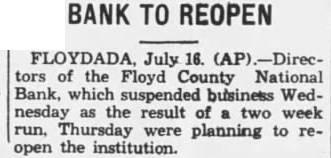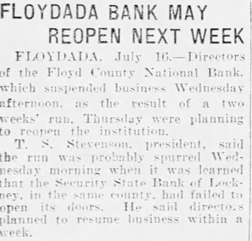 Floydada Bank to at Once FLOYDADA, July ors of the Floyd County National which suspended business yesterday afternoon as the climax two weeks slow run, today planning reopening of the Stevenson, president of the bank, said the run was probably spurred Wednesday morning announcement reached Floydada telling of the failure of the Security State bank of Lockney, in the same county, to open its doors for business. Mr. said the rectors expected to have the bank reorganized open for business within week.