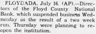 BANK TO REOPEN FLOYDADA, July 16. tors of the Floyd County National Bank, which Wednesday as the result of two week run, Thursday were planning to reopen the institution.