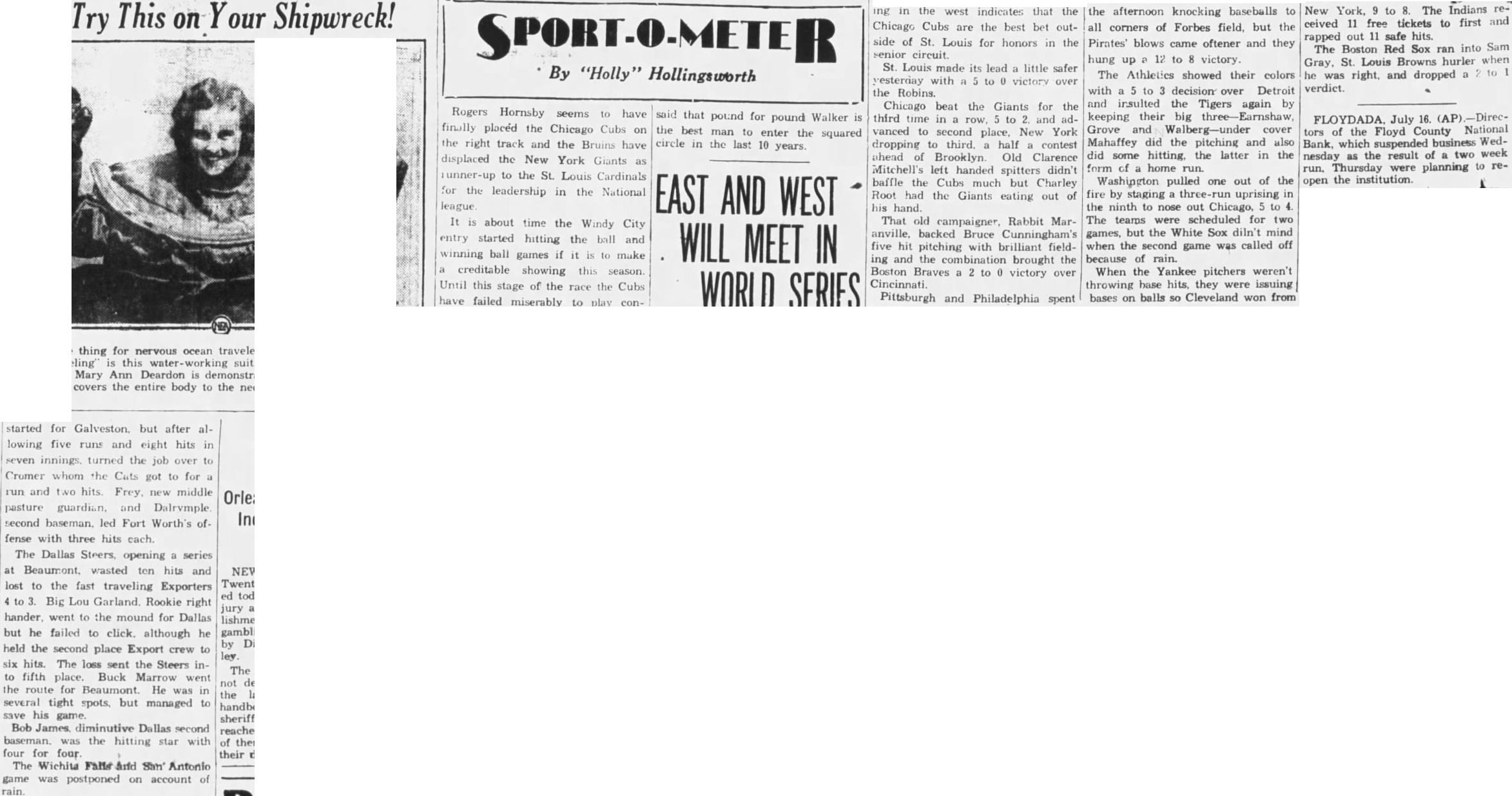 Try This on Your Shipwreck! started for Galveston. but after allowing five runs and eight hits in seven innings turned the job over to Cromer whom the Cuts got to for run and two hits. Frey. new middle pasture guardian. and Dalrymple second baseman, led Fort Worth's offense with three hits cach. The Dallas Steers. opening series at Beaumont, wasted ten hits and lost to the fast traveling Exporters to Big Lou Garland. Rookie right hander. went to the mound for Dallas but he failed to click. although he held the second place Export crew to ley six hits. The loss sent the Steers into fifth place. Buck Marrow went the route for Beaumont. He was in several tight spots, but managed to save his Bob James. diminutive Dallas second baseman. was the hitting star with four for four The Wichita Falls arid San Antonio game was postponed on account of ing in the west indicates that the Chicago Cubs are the best bet outside of St. Louis for honors in the senior circuit. St. Louis made its lead little safer yesterday with a 5 to 0 victory over the Robins Chicago beat the Giants for the third time in a row. to 2. and advanced to second place, New York dropping to third a half contest ahead of Brooklyn. Old Clarence Mitchell's left handed spitters didn't baffle the Cubs much but Charley Root had the Giants eating out of his hand. That old campaigner, Rabbit Maranville, backed Bruce Cunningham's five hit pitching with brilliant fielding and the combination brought the Boston Braves a 2 to 0 victory over Cincinnati. Pittsburgh and Philadelphia spent the afternoon knocking baseballs to all corners of Forbes field, but the Pirates' blows came oftener and they hung up 12 to 8 victory The Athletics showed their colors with a 5 to 3 decision over Detroit and insulted the Tigers again by keeping their big -Earnshaw, Grove and Walberg-under cover Mahaffey did the pitching and also did some hitting, the latter in the form of home run Washington pulled one out of the fire by staging three-run uprising in the ninth to nose out Chicago, 5 to 4 The teams were scheduled for two games, but the White Sox diln't mind when the second game was called off because of rain. When the Yankee pitchers weren't throwing base hits, they were issuing bases on balls so Cleveland won from New York, 9 to 8. The Indians received 11 free tickets to first and rapped out 11 safe hits. The Boston Red Sox ran into Sam Gray, St. Louis Browns hurler when he was right, and dropped a 2 to 1 verdict. FLOYDADA, July 16. tors of the Floyd County National Bank, which suspended business Wednesday as the result of a two week run. Thursday were planning to reopen the institution.