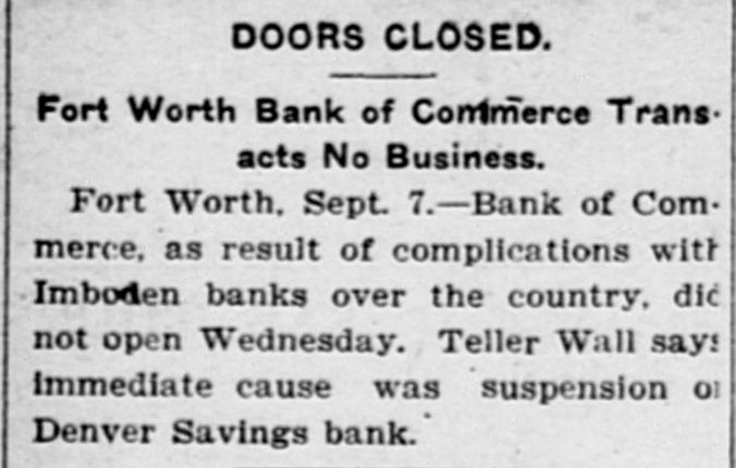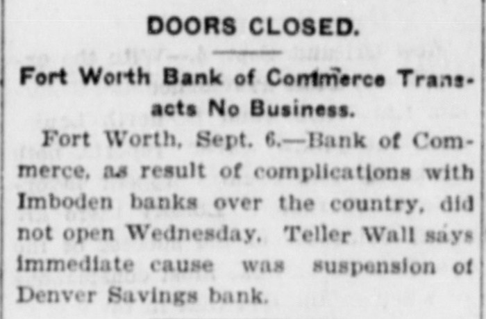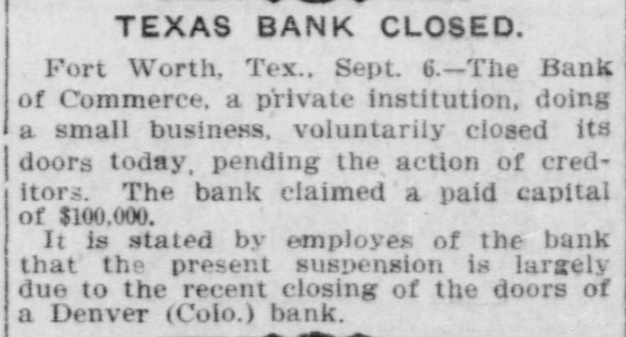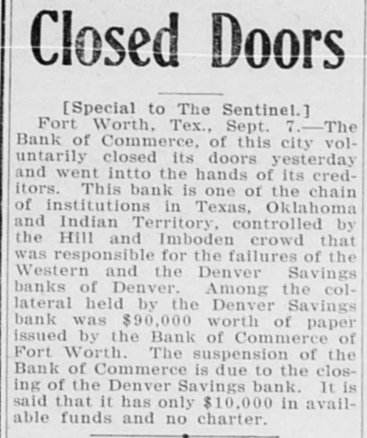 SMALL TEXAS FAILURE. The Closing of a Bank With a Pretentious Name. o Fort Worth, Texas, Sept. 6.-The Bank of Commerce a private institution doing a small business, voluntarily closed its doors today pending action of the creditors. The bank claimed a paid capital of $100,000. It is stated by employes of the bank that the present suspension is largely due to the recent closing of the doors of a Denver, Colo., ank. President R. E. Maddox of the bank was seen tonight. He said the institution is owned by Leonard Imboden and J. A. Hill of Enid, Okla. To the depositors of the bank he said was due about $9,000 which constituted the principal indebtedness. It was the opinion of the bank employes ne said that the assets would about balance liabilities.