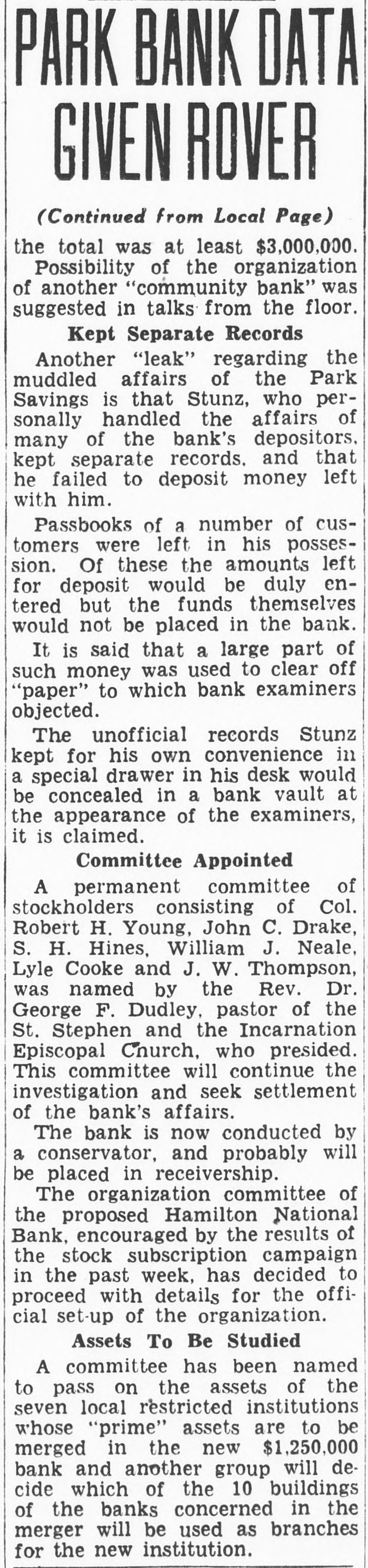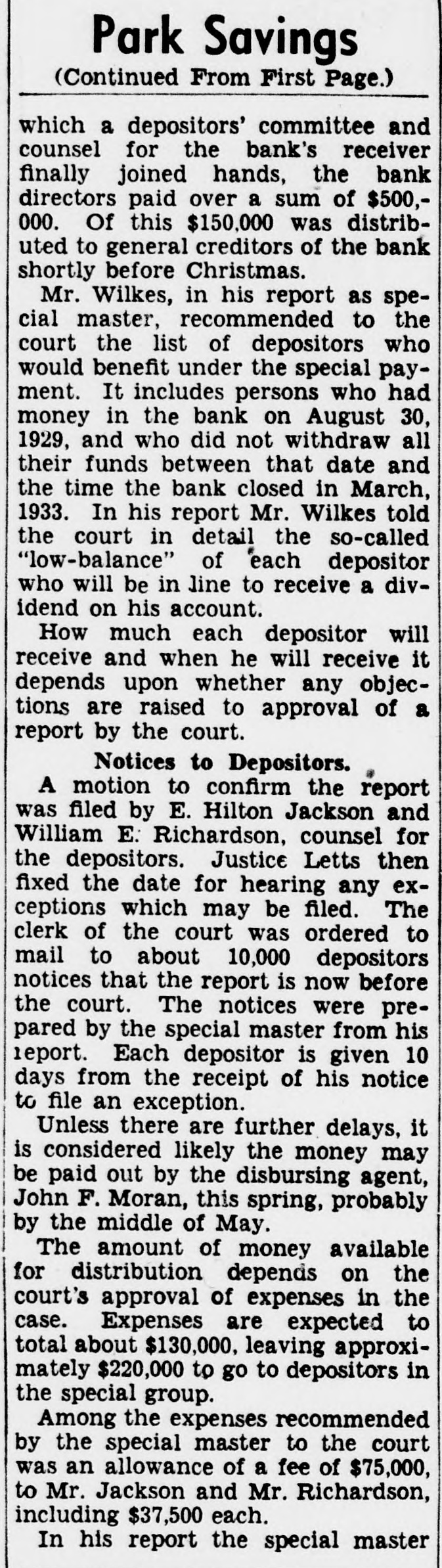PROGRESS SEEN INREOPENING OF DISTRICT BANKS Stockholders and Depositors Are Backing Reorganization Plans Being Offered Them By RICHARD HATTON While little information has been available regarding the closed banks of Washington and while the Treasury Department has not as yet made any public statement regarding the local situation there has not been lack. ing determined effort upon the part of officials of closed institutions to evolve plans for reopening and progress has been made charge of number of the institutions being liquidated. More activity has been in the affairs of receivership banks than in those of conservator banks but both classc of institutions are probably suffering from the lack of exhortation anterooms of the Treasury. Stockholders of the Franklin National Bank yesterday appeared to be enthusiastic over the reorganization plan just announced by that institution and there every for believing that, if the Treasury approves, the plan will ultimately be carried though successfully. MANY DEPOSITORS AGREE Yesterday the services of several directors of the Franklin as well as those of the officers were required to handle the long line of de ositors appearing to sign agreements which it is believed will permit the reopening of the bank. Many of these depositors were enthusiastic in their support of the outlined in letters previously sent out by the bank. Stockholders appeared to be perfectly willing to agree to waive 33 1-3 per cent of their deposits on March 14 leaving the balance available for regular transactions, according to the plan. For this 33 1-3 per cent waived all assets not accepted by the reorganized bank will trusteed and participating certificates for the amounts waived be issued to be paid off out of realization upon assets as fast as they become available. Stockholders are also purchasing stock in bank equal to 6 per cent of their deposits on March 14. WAIT TREASURY WORD With stock stopped after 75 per cent of the required amount had been subscribed and with every assurance that total amount can easily be obtained, the Potomac Savings Bank is only awaiting some word from the Treasury to carry out its plan of reorganization. Meanwhile Receiver J. S. Bryan of the North Capitol Bank has paid out about $90,000 to depositors; the Northeast Savings Bank in charge of President George F Hoover has sold 7,600 of the 10,000 shares required for reorganization; pay ments have been made to depositors of the Bank of Bright wood by Claude H the Departmental Bank by Receiver W. B. Allman and the International Exchange Bank by Receiver T. Dinger and all of these institutions are working toward another percent age payment. The one big mystery among the receivership banks the Park Savings. As institution there no information available and even sensational rumor seems to have dried up.