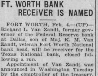 FT. WORTH BANK RECEIVER IS NAMED FORT WORTH, Feb. Richard Van Zandt, former gov. ernor of the Federal Reserve bank Dallas, son of Maj. K. M. Van Zandt, Worth National bank head, will for Texas bank, closed following run. of Van Zandt was announced in Tuesday by the of the treasury.
