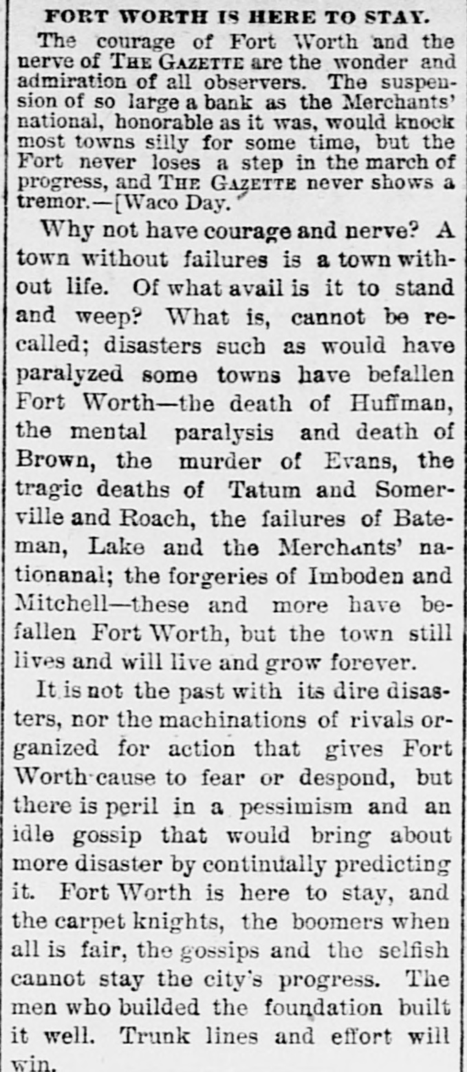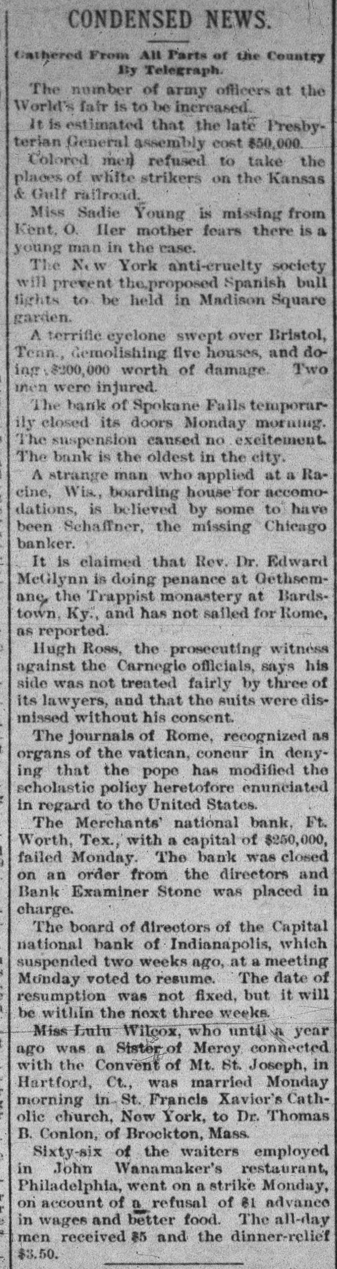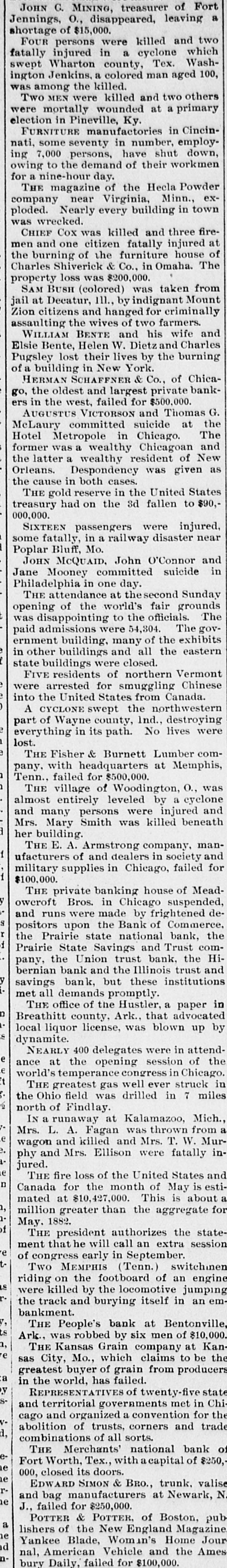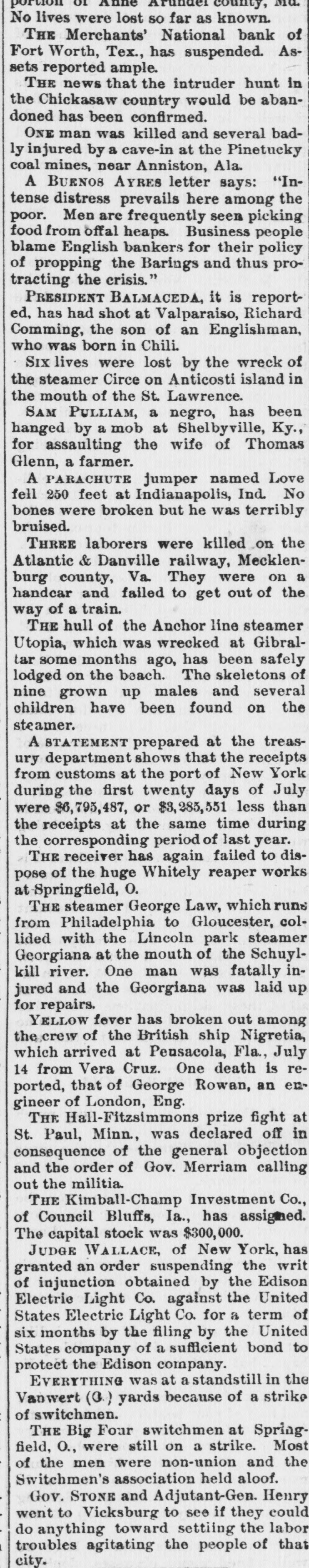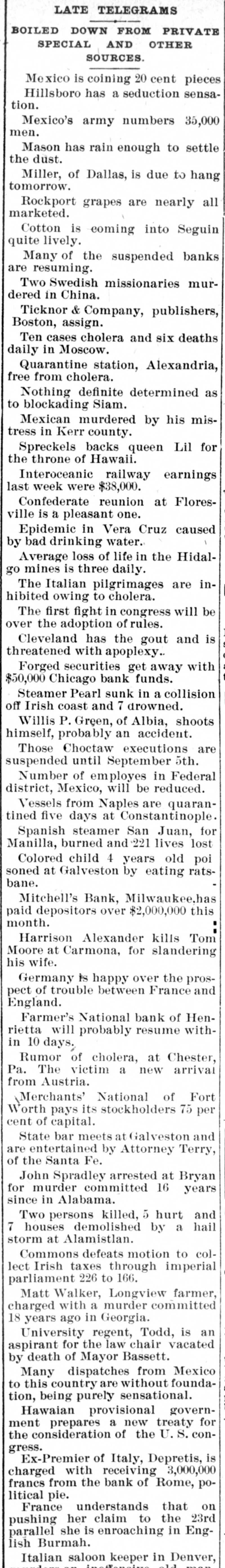 LATE TELEGRAMS BCILED DOWN FROM PRIVATE, SPECIAL AND OTHER SOURCES. Railway strike at Paris collapses. Forty houses destroyed by fire in Guadalajara, Spain. Taylor will put up for railway connection with M. K. & T. at Trinity. President Finney, of Soo and South shore, at Minneapolis, resigns. The I. & G. N. receivership meets at Austin Monday the 27th. Governor of Minnesota and sheriff refuse to interfere in the prize fight A. Friedlander, Gainesville china merchant, fails. Two boys arrested at Tracy City, Tenn., for murdering a peadler. The state railway commission gives audience at Dallas to shippers. Jim Huntley wanted in Texas for forgery, extradited at Toronto. Mrs. Maybrick is denied the $10,000 insurance on her husband's lite. Another civil conflict is immenent in Samoa. Laredo is disconsolate over the Sunday law enforcement. San Angelo has shipped 3,000,000 pounds wool this season. Good rains at Belton give assurance of immense cotton crop. The Austin soldiers find running guard for beer rather risky business. The Austin riot is set for today, and the boys will have a circus. Major Ford is medical director of the Austin camp. Llewellen of Waco is charged with criminal assault on a young married woman. Uruguay is threatened with bankruptey. Clarkson says Quay wanted to resign immediately after Harrison's election. Patrick Kelly, Galveston jailer, from injuries received from an insane prisoner. J. S. Schweitzer's will probated at New Orleans; several public charities get from $5000 to $10,000 each. The Tennessee miners canture the militia and convicts and ship them to Knoxville. There will be bloodshed at Bruce. ville, Tenn., over the attempt to work convict miners. Gov. of Tennessee is urged to arrest and punish the miners, who took the camp. The miners threaten to destroy the bridges and burn the railroad if troops are sent Detail ha® been made for court martials at Austin, Major A. W. Houston judge advocate. San Antonio elect, ic ca's are doing temporary duty at Austin during encampment. There are about 2500 men In camp at Austin, one third regulars, the rest militia. Georgetown chautaqua closes, a nd gives a donation of $1,000 to the 80. ciety. Lawyerville, a Michigan lumber town of fifty buildings and mills, destroyed by fire Texas gets her world's fair building site set apart before the money is raised for it. Merchants national bank at Fort Worth is pronounced solvent, and will reopen in 30 days. R. Crain, San Jacinto veteran drowned in the Bosque, at Valley Mills. The Erie threatens to cat central traffic rates unless New England roads stop scalping. Reagan says rates cannot be established to give one place advantage over another. Railway committee is considering grain, cotton, lumber, and salt rates today. Silver is gradually nearing the $1 00 mark on the New York exchange. A revenue vessel will probably be sent to Eastport, Me., to protect American fishermen. Union Investment company of Kansas City, Winner's bursted concern, will be reorganized. Central bank, Kansas City, Kas., fails through failure of the Wyandotte bank. Petition for an Austrian society, to perpetuate national feeling, refused at St. Louis. An immense concourse of St. Paul people protest against the Hall-Fitzsimmons fight. Contract let for grading and ironing the road from Denison to Nebraska state line. Chairman of Chicago and Alton will pay no attention to Western Passenger association rates made without consulting them. Senator Quay has desired to resign as chairman of the republican com-