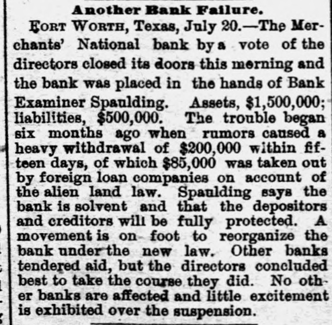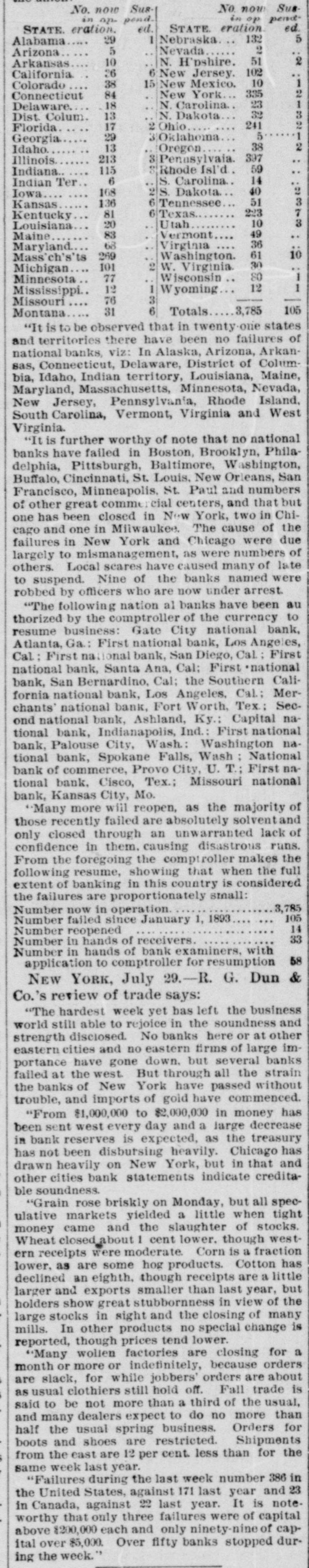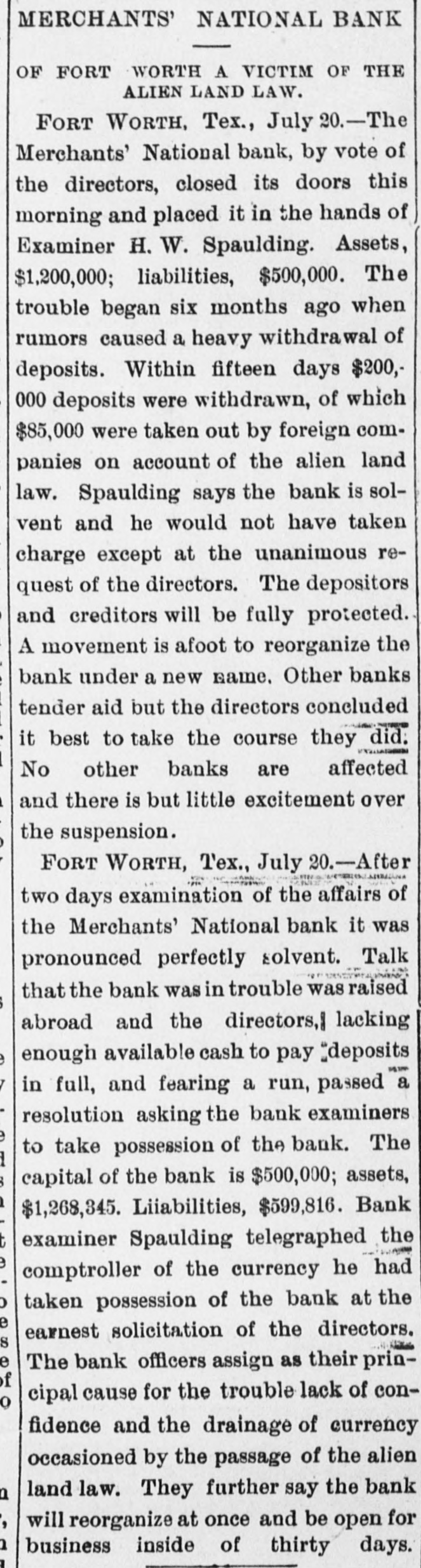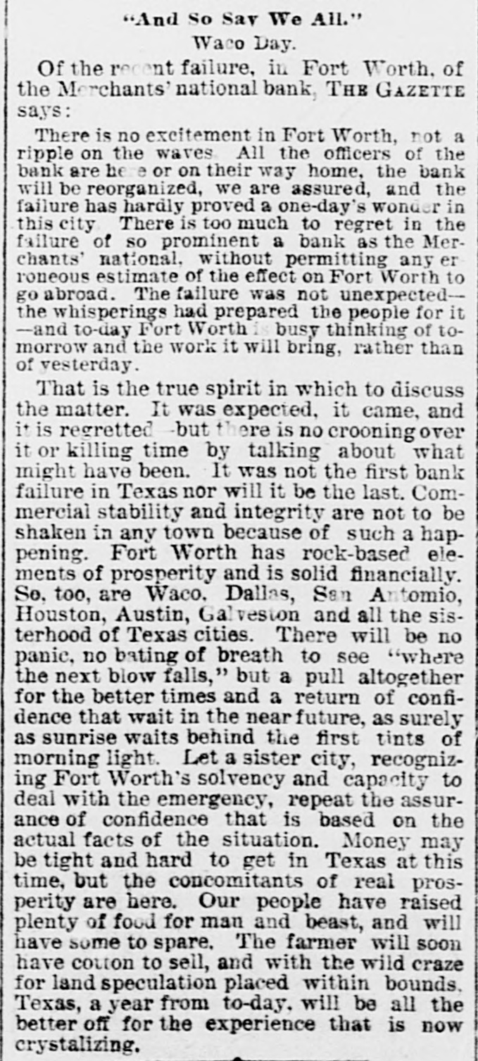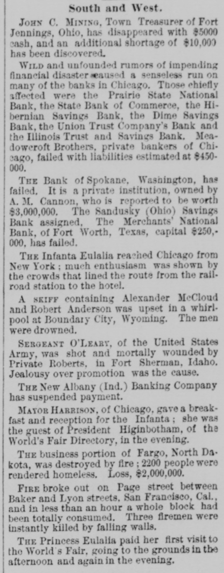 LATE TELEGRAMS BCILED DOWN FROM PRIVATE, SPECIAL AND OTHER SOURCES. Railway strike at Paris collapses. Forty houses destroyed by fire in Guadalajara, Spain. Taylor will put up for railway connection with M. K. & T. at Trinity. President Finney, of Soo and South shore, at Minneapolis, resigns. The I. & G. N. receivership meets at Austin Monday the 27th. Governor of Minnesota and sheriff refuse to interfere in the prize fight A. Friedlander, Gainesville china merchant, fails. Two boys arrested at Tracy City, Tenn., for murdering a peadler. The state railway commission gives audience at Dallas to shippers. Jim Huntley wanted in Texas for forgery, extradited at Toronto. Mrs. Maybrick is denied the $10,000 insurance on her husband's lite. Another civil conflict is immenent in Samoa. Laredo is disconsolate over the Sunday law enforcement. San Angelo has shipped 3,000,000 pounds wool this season. Good rains at Belton give assurance of immense cotton crop. The Austin soldiers find running guard for beer rather risky business. The Austin riot is set for today, and the boys will have a circus. Major Ford is medical director of the Austin camp. Llewellen of Waco is charged with criminal assault on a young married woman. Uruguay is threatened with bankruptey. Clarkson says Quay wanted to resign immediately after Harrison's election. Patrick Kelly, Galveston jailer, from injuries received from an insane prisoner. J. S. Schweitzer's will probated at New Orleans; several public charities get from $5000 to $10,000 each. The Tennessee miners canture the militia and convicts and ship them to Knoxville. There will be bloodshed at Bruce. ville, Tenn., over the attempt to work convict miners. Gov. of Tennessee is urged to arrest and punish the miners, who took the camp. The miners threaten to destroy the bridges and burn the railroad if troops are sent Detail ha® been made for court martials at Austin, Major A. W. Houston judge advocate. San Antonio elect, ic ca's are doing temporary duty at Austin during encampment. There are about 2500 men In camp at Austin, one third regulars, the rest militia. Georgetown chautaqua closes, a nd gives a donation of $1,000 to the 80. ciety. Lawyerville, a Michigan lumber town of fifty buildings and mills, destroyed by fire Texas gets her world's fair building site set apart before the money is raised for it. Merchants national bank at Fort Worth is pronounced solvent, and will reopen in 30 days. R. Crain, San Jacinto veteran drowned in the Bosque, at Valley Mills. The Erie threatens to cat central traffic rates unless New England roads stop scalping. Reagan says rates cannot be established to give one place advantage over another. Railway committee is considering grain, cotton, lumber, and salt rates today. Silver is gradually nearing the $1 00 mark on the New York exchange. A revenue vessel will probably be sent to Eastport, Me., to protect American fishermen. Union Investment company of Kansas City, Winner's bursted concern, will be reorganized. Central bank, Kansas City, Kas., fails through failure of the Wyandotte bank. Petition for an Austrian society, to perpetuate national feeling, refused at St. Louis. An immense concourse of St. Paul people protest against the Hall-Fitzsimmons fight. Contract let for grading and ironing the road from Denison to Nebraska state line. Chairman of Chicago and Alton will pay no attention to Western Passenger association rates made without consulting them. Senator Quay has desired to resign as chairman of the republican com-