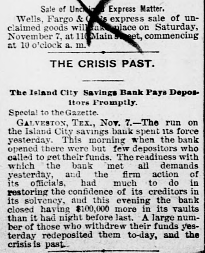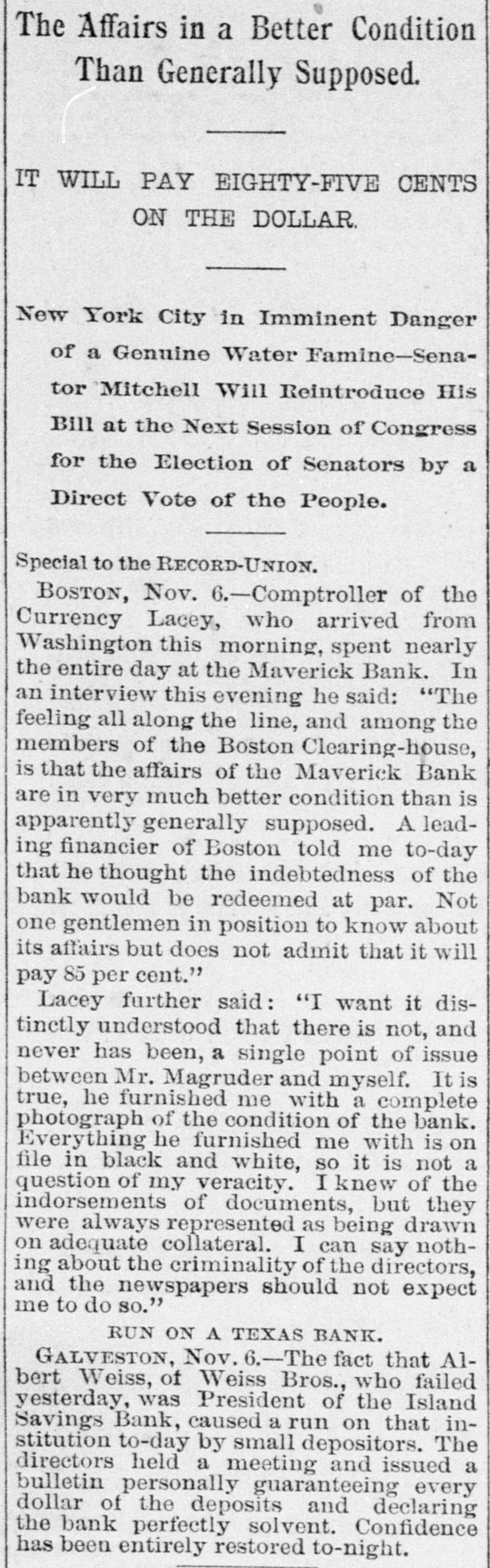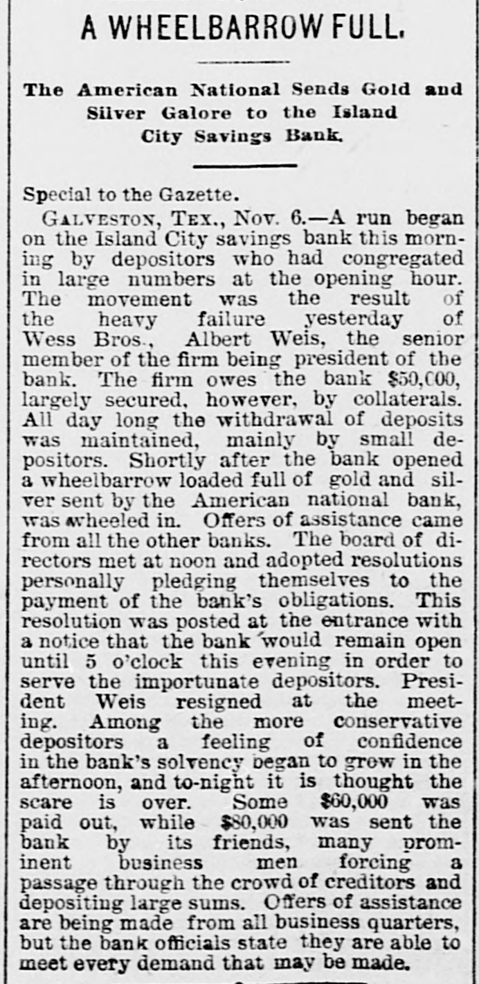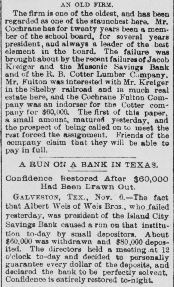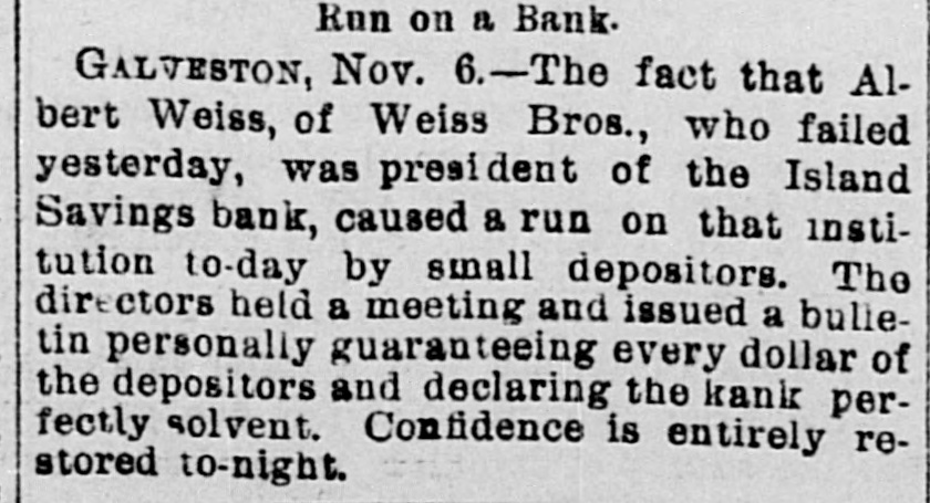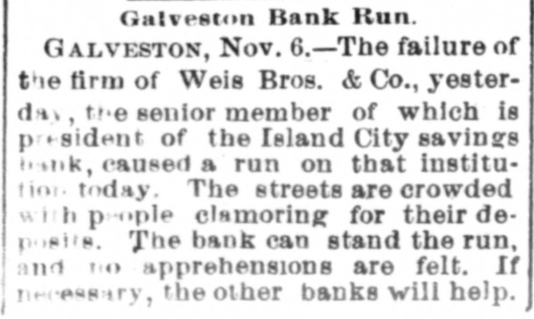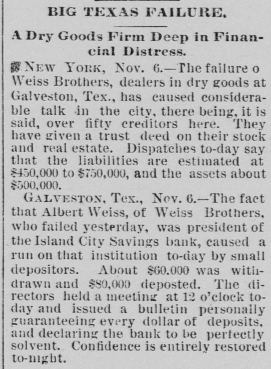 BIG TEXAS FAILURE, A Dry Goods Firm Deep in Financial Distress. NEW YORK, Nov. 6.-The failure 0 Weiss Brothers, dealers in dry goods at Galveston, Tex., has caused considerable talk in the city, there being, it is said, over fifty creditors here. They have given a trust deed on their stock and real estate. Dispatches to-day say that the liabilities are estimated at $450,000 to $750,000, and the assets about $500,000. GALVESTON, Tex., Nov. 6.-The fact that Albert Weiss, of Weiss Brothers, who failed yesterday, was president of the Island City Savings bank, caused a run on that institution to-day by small depositors. About $60.000 was withdrawn and $80,000 deposted. The directors held a meeting at 12 o'clock today and issued a bulletin pérsonally guaranteeing every dollar of deposits, and declaring the bank to be perfectly solvent. Confidence is entirely restored to-night.