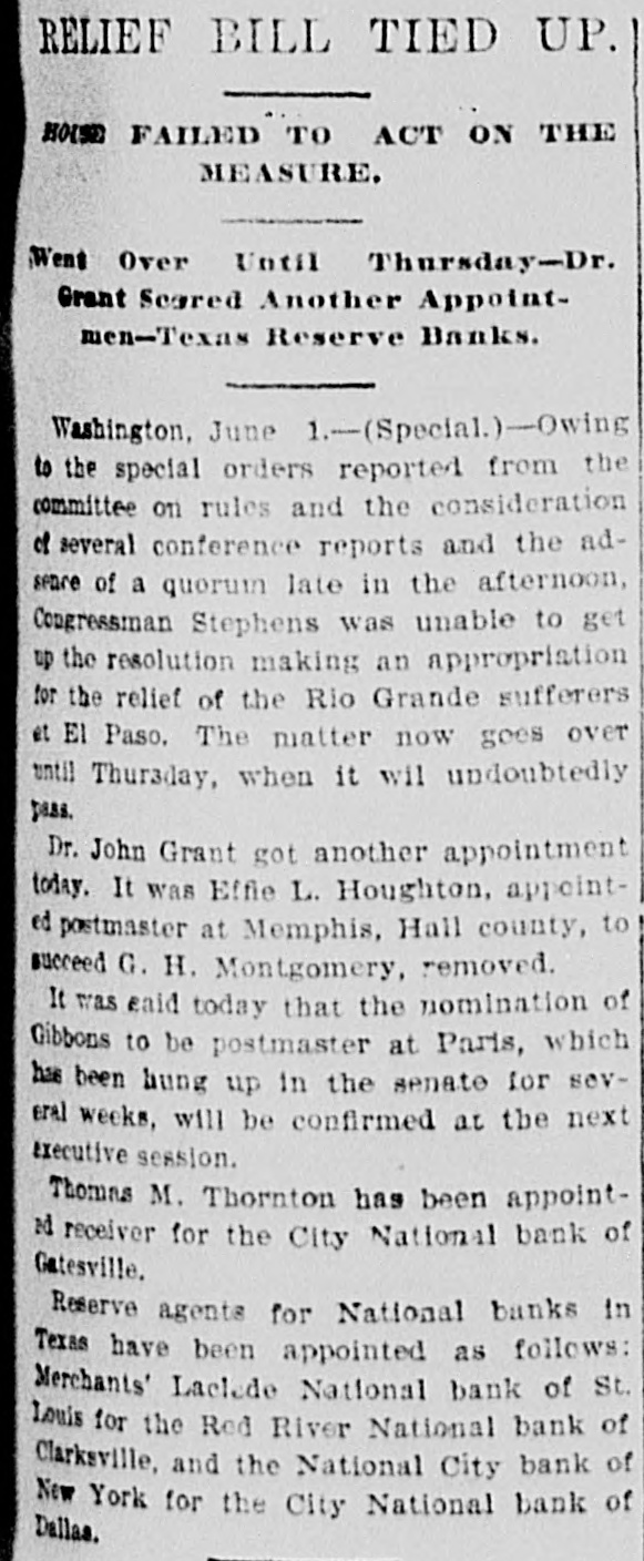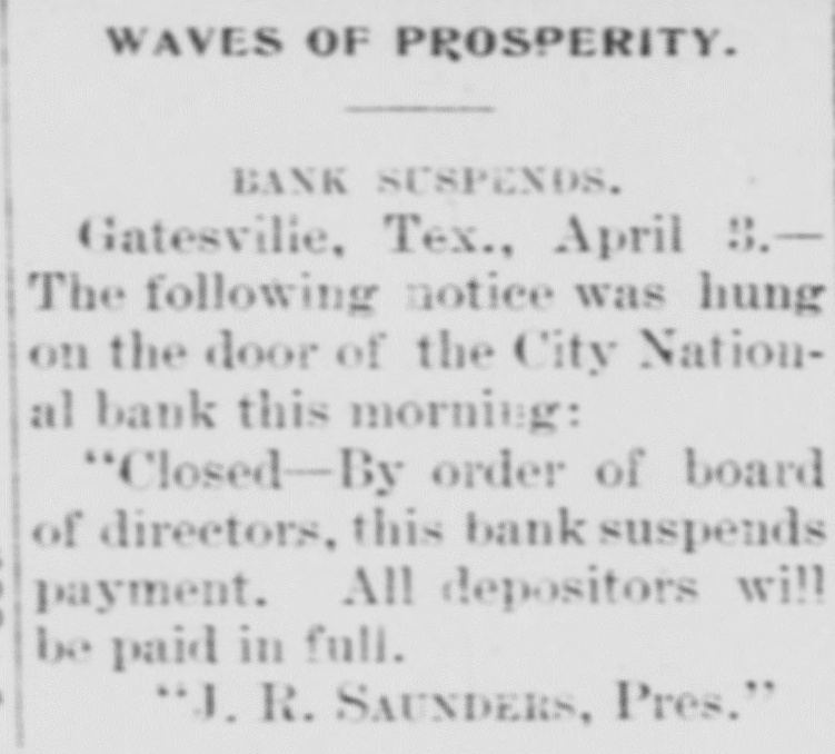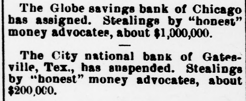 money advocates, about $1,000,000. The City national bank of Gatesville, Tex., has suspended. Stealings by "honest" m.oney advocates, about $200,000. The Lebanon, Pa., rolling mills company has made an assignment. W. C. Eccleston, grocer at Natick, R I., has filed a petition in insolvency. A receiver has been appointed for the Salem iron company, of Leetonia, Ohio. J. M. Pancake, general store and gin, at Bush, Tex., has given a trust deed. E. Albertson, dealer in notions, at Hannibal, Mo., has made an assignment. The sheriff has closed the store of W. C. Bernardi, dealer in dry goods at Pittsburg, Pa. E. D. Neustadt & Co., flour commission dealers of New York city, have assigned. A receiver has been appointed for Lundy & Smith, general store at Duncombe, Ia. The American exchange bank of Buffalo, N. Y., has gone into voluntary liquidation. The Bank of Bartley, Neb., is closing its affairs, and is paying depositors' claims in full. It is not run by "honest" money advocates. The Jacksonville, Tampa and Key West railway has been offered for sale in Jacksonville, Fla. George S. Kinney's Sons, wholesale liquor dealers, at Nashville, Tenn., have made an assignment. Tanner & Stark, general store, at Otter Lake, Mich., have given a chattel mortgage in trust for $7,800. L. Graham & Son, printers at New Orleans, have called a meeting of creditors to ask an extension. The Stratto Bros. Company, dealer in dry goods at Gardner, Mass., has made an assignment. The First national bank of Comanche, Tex., chartered in 1886, capital $100,000, surplus $20,000, closed its doors. "Honest" money the cause. James B. Brewster & Co., reorganized, carriage manufacturers at New York, have assigned without preferences. C. Henry Gabel, an undertaker, contractor and builder, of Pottstown, Pa., has made an assignment. The Citizens' bank of Bowling Green, Mo., suspended April 2. It had a paid in capital of $25,000 and deposits of $100,000. "Honest" money did it up. An assignment for the benefit of creditors has been made by the Safe deposit building and loan association in Kensington, Ohio. "Honest" money did it. A. J. Davidson & Co., wholesale dealers in produce and agricultural implements at Helena, Mont., have been attached for $8,000. The comptroller of the currency has given authority for the organization of the First national bank of Greensboro, Pa.; capital, $50,000. Hurrah for "sound" money. The Cumberland coal company, at Sturgis, Ky., owned by capitalists of Nashville, Tenn., with W. W., Smith as president, has assigned. Edward S. and Henry V. Williams, stockholders of the New York history company, have applied for the appointment of a receiver. The Colchester, Ct., savings bank has been enjoined from paying out deposits or paying dividends on deposits. Over $50,000 has been withdrawn from the bank within the past six months. Economy No Panacea. When you hear a man discoursing (un) learnedly about economy and saving something out of his scanty income by subsisting on a poorer living and depriving himself of every species of enjoyment and leisure he hasn't stu.