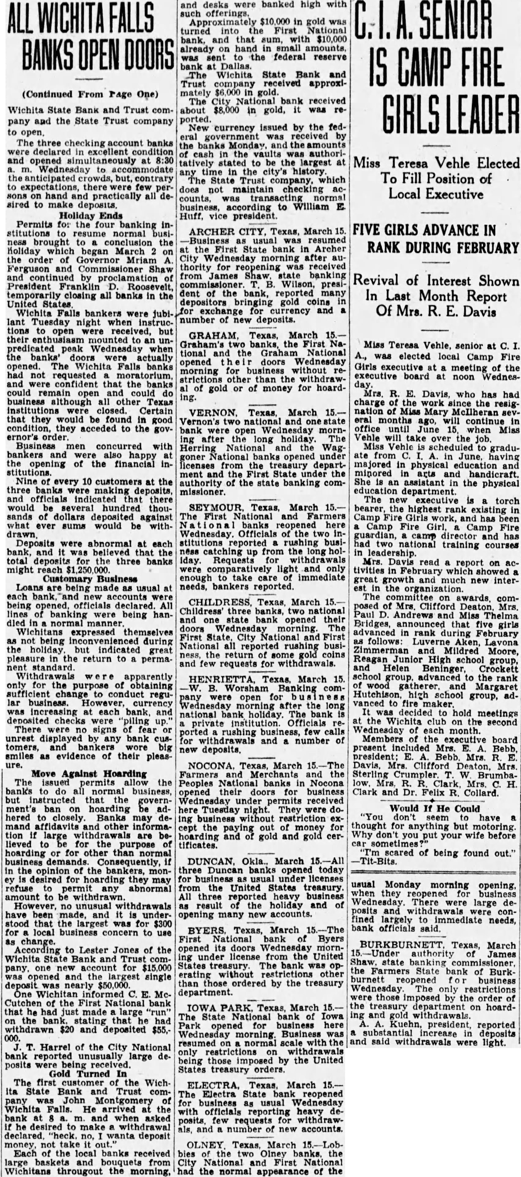 BANKS (Continued From Page One) Wichita State Bank and Trust company and the State Trust company The three account banks were declared excellent and opened simultaneously Wednesday to accommodate anticipated contrary expectations, sons hand and practically all desired to make deposits. Holiday Ends Permits for four banking institutions to resume normal brought conclusion the Holiday began March the order of Governor Mriam and by President Franklin Roosevelt, temporarily closing all banks in the United Wichita Falls bankers were jubilant Tuesday night when were but mounted to an predicated peak Wednesday the banks' doors actually opened. Wichita Falls banks not requested moratorium, that the banks business institutions closed. Certain they would be found condition, they acceded to the gov. ernor's order Business men concurred with happy the opening of the financial Nine every 10 customers at the three banks making deposits, officials indicated there would several hundred thousands dollars deposited against what ever sums would be withdrawn Deposits were abnormal at each bank, and believed total deposits the three banks might reach Business Loans are being made usual being opened, officials declared. All lines banking were being hanin normal expressed themselves not being during the holiday indicated in the return to permaWithdrawals apparently for the purpose of obtaining sufficient change to conduct regular business. increasing at each bank, and piling There signs fear unrest displayed by any bank customers, smiles as evidence of their pleas- Move Against Hoarding the normal business, the ment's on hoarding hered Banks may mand affidavits and other informaare lieved hoarding for other than business Consequently, in the opinion the bankers, mondesired for hoarding they may refuse permit any abnormal unusual withdrawals been and understood the largest for $300 for local business concern to use as change. to Lester Jones of the Wichita State and Trust for $15,000 opened and single deposit nearly One Wichitan informed E. Cutchen of the First bank had just made large bank withdrawn $20 and deposited $55,- T. Harrel of the City National bank reported large posits being received. Gold Turned In The the Wichita Bank Trust Wichita Falls. He arrived the and when asked he desired to withdrawal declared. "heck. no, wanta deposit not Each local banks received Wichitans througout the morning, and desks were banked high with $10,000 in gold was turned the First National bank, and that sum, with $10,000 already on hand small to the federal reserve bank Wichita State Bank and Trust company received approximately The City National bank received about $8,000 in gold, was reported. New currency issued by the federal government was cash the authoritatively stated to be the largest at time in the city's history State Trust company, which does maintain checking accounts, according to William E. vice president. ARCHER CITY, Texas, March -Business usual resumed the in Archer after thority for received from James banking Wilson, dent of the bank, reported many depositors bringing gold coins of deposits. GRAHAM, Texas, March Graham's banks, the First National the Graham National opened doors Wednesday morning for without strictions other than the withdrawgold of money for hoarding. bank were open Wednesday mornafter the long holiday. Herring National and the Waggoner opened under licenses the treasury department and State the authority the state com- SEYMOUR, Texas, March The First National and banks Wednesday Officials two stitutions reported rushing busifrom the long Requests comparatively light and enough take care needs, reported. CHILDRESS, Texas March three banks, two state opened morning. The First State, City First National all rushing busireturn some coins and few requests for withdrawals. HENRIETTA Texas. March 15. Worsham Banking comwere open for morning after the long national holiday. The bank Officials rushing few for and number new NOCONA. Texas, March Farmers and Peoples banks Nocona opened their for business Wednesday under permits received here Tuesday night. They doing business without restriction cept the paying out of money for hoarding gold and gold certificates. DUNCAN, Okla., March Duncan banks opened today for business usual under licenses from the United States treasury. All three reported heavy business as result of the holiday and of opening many new accounts. BYERS. Texas, March National bank Byers opened its doors mornlicense from the United States treasury. The bank was erating without restrictions other those ordered by the treasury department. IOWA PARK. Texas, March The State bank Iowa Park opened for business here Wednesday morning. Business resumed on normal being those by the United States treasury orders. ELECTRA, Texas. March The Electra State reopened as Wednesday with officials reporting heavy few requests for withdrawand number new accounts OLNEY. Texas, March City National First the normal appearance of the BURKBURNETT Texas, March authority James Shaw. state banking commissioner. the Farmers State bank of Burkburnett for business Wednesday The only those imposed by the order the treasury department on hoardand gold withdrawals. Kuehn, president, reported substantial increase in deposits said withdrawals were light.