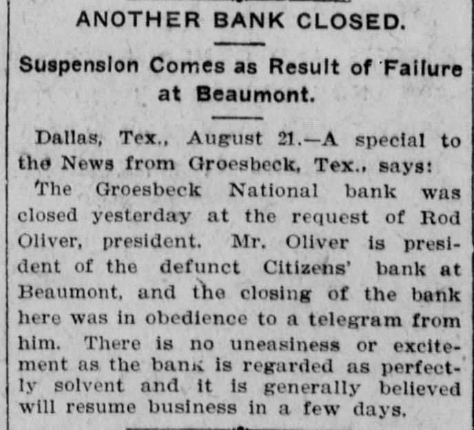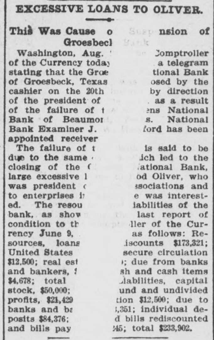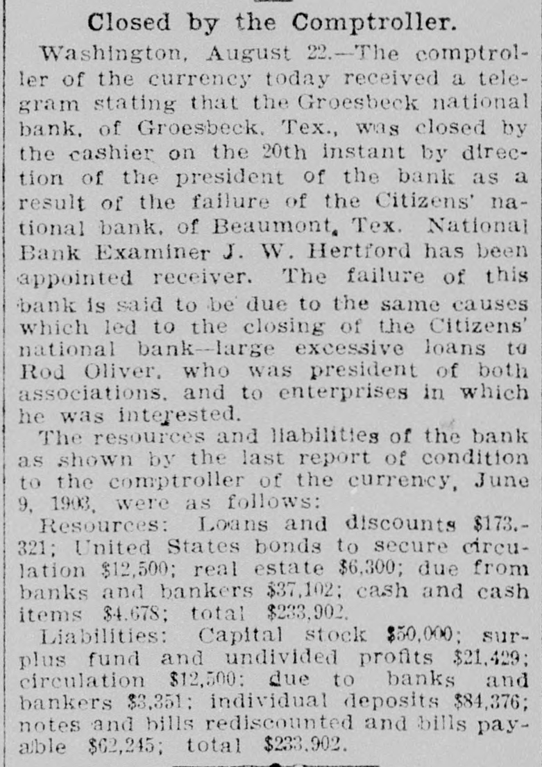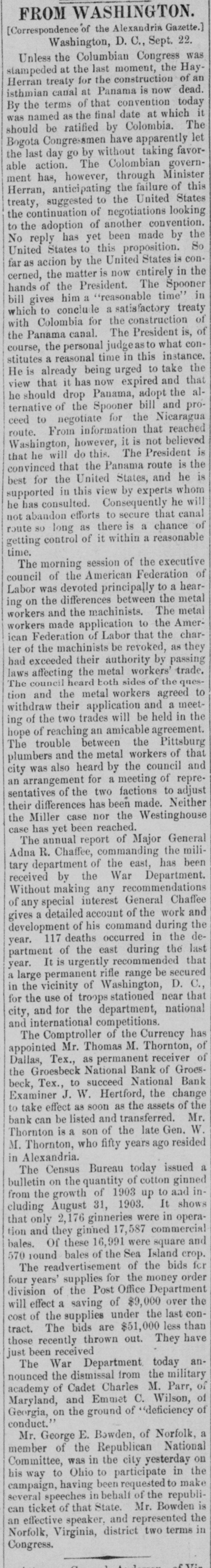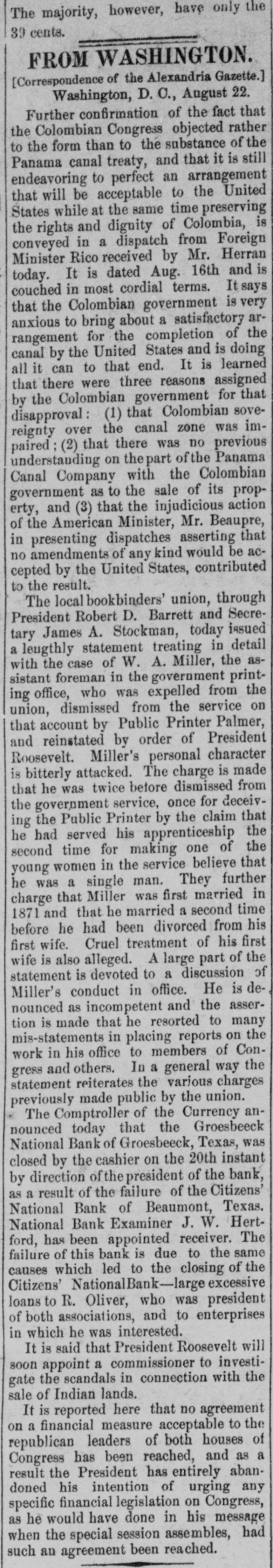 The majority, however, have only the 39 cents. FROM WASHINGTON. [Correspondence of the Alexandria Gazette.] Washington, D. C., August 22. Further confirmation of the fact that the Colombian Congress objected rather to the form than to the substance of the Panama canal treaty, and that it is still endeavoring to perfect an arrangement that will be acceptable to the United States while at the same time preserving the rights and dignity of Colombia, is conveyed in a dispatch from Foreign Minister Rico received by Mr. Herran today. It is dated Aug. 16th and is couched in most cordial terms. It says that the Colombian government is very anxious to bring about a satisfactory arrangement for the completion of the canal by the United States and is doing all it can to that end. It is learned that there were three reasons assigned by the Colombian government for that disapproval: (1) that Colombian sovereignty over the canal zone was impaired; (2) that there was no previous understanding on thepart of the Panama Canal Company with the Colombian government as to the sale of its property, and (3) that the injudicious action of the American Minister, Mr. Beaupre, in presenting dispatches asserting that no amendments of any kind would be accepted by the United States, contributed to the result. The local bookbinders' union, through President Robert D. Barrett and Secretary James A. Stockman, today issued a lengthly statement treating in detail with the case of W. A. Miller, the assistant foreman in the government printing office, who was expelled from the union, dismissed from the service on that account by Public Printer Palmer, and reinstated by order of President Roosevelt. Miller's personal character is bitterly attacked. The charge is made that he was twice before dismissed from the government service, once for deceiving the Public Printer by the claim that he had served his apprenticeship the second time for making one of the young women in the service believe that he was a single man. They further charge that Miller was first married in 1871 and that he married a second time before he had been divorced from his first wife. Cruel treatment of his first wife is also alleged. A large part of the statement is devoted to a discussion of Miller's conduct in office. He is denounced as incompetent and the assertion is made that he resorted to many mis-statements in placing reports on the work in his office to members of Congress and others. In a general way the statement reiterates the various charges previously made public by the union. The Comptroller of the Currency announced today that the Groesbeeck National Bank of Groesbeeck, Texas, was closed by the cashier on the 20th instant by direction of the president of the bank, as a result of the failure of the Citizens' National Bank of Beaumont, Texas. National Bank Examiner J. W. Hertford, has been appointed receiver. The failure of this bank is due to the same causes which led to the closing of the Citizens' NationalBank-large excessive loans to R. Oliver, who was president of both associations, and to enterprises in which he was interested. It is said that President Roosevelt will soon appoint a commissioner to investigate the scandals in connection with the sale of Indian lands. It is reported here that no agreement on a financial measure acceptable to the republican leaders of both houses of Congress has been reached, and as a result the President has entirely abandoned his intention of urging any specific financial legislation on Congress, as he would have done in his message when the special session assembles, had such an agreement been reached.