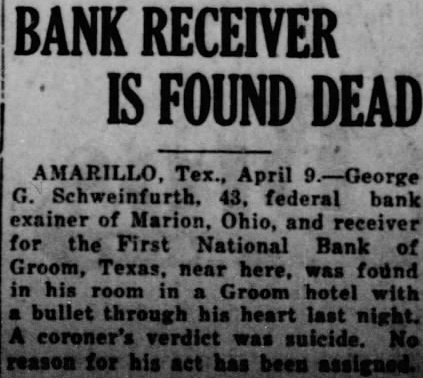 Article (1926-04-09) reports the bank's receiver (federal bank examiner and receiver for First National Bank, Groom) was found dead. This indicates the bank was in receivership/closed. No article text mentions a depositor run or an earlier suspension explicitly; receivership implies closure, so classified as suspension_closure. Limited OCR excerpt; date taken from newspaper publication.