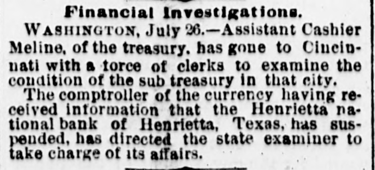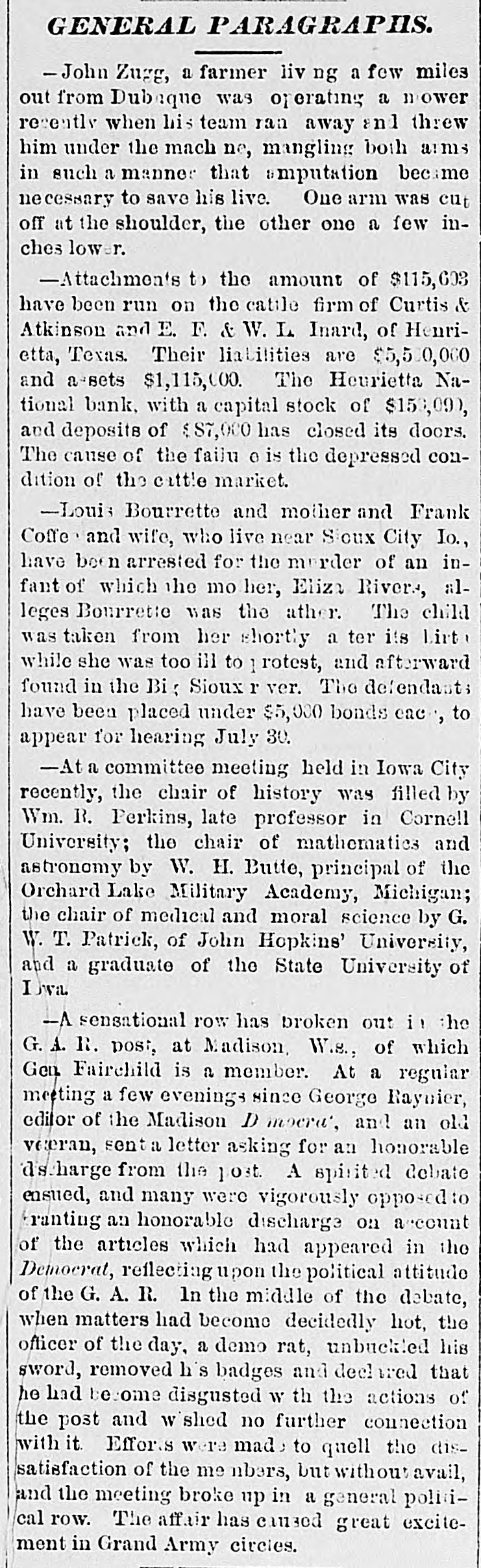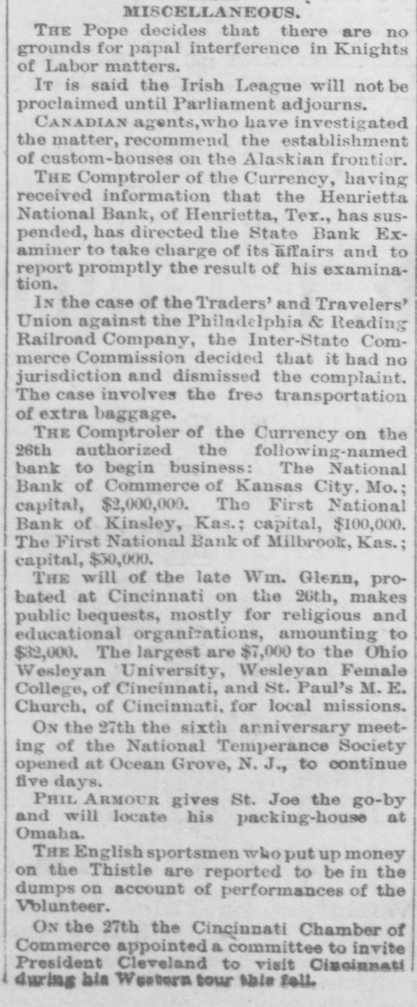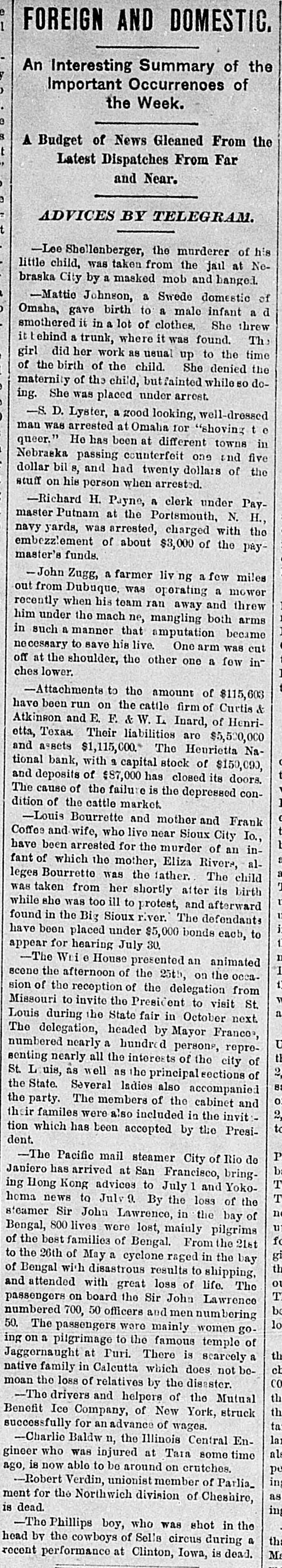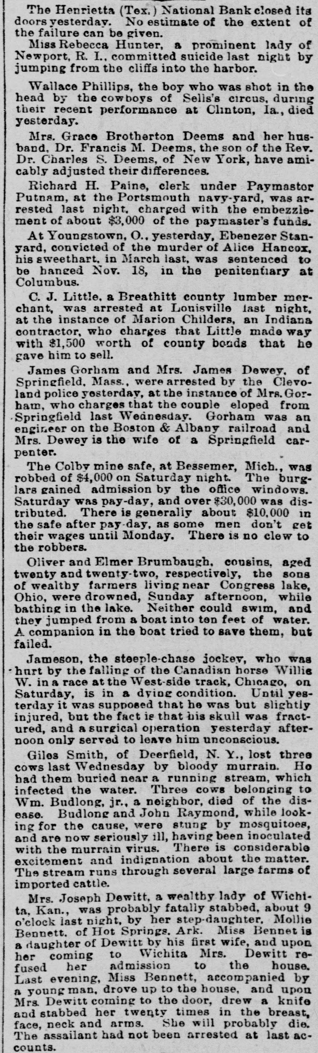 The Henrietta (Tex.) National Bank closed its doors yesterday. No estimate of the extent of the failure can be given. Miss Rebecca Hunter, a prominent lady of Newport, R. I., committed suicide last night by jumping from the cliffs into the harbor. Wallace Phillips, the boy who was shot in the head by the cowboys of Sells's circus, during their recent performance at Clinton, Ia, died yesterday. Mrs. Grace Brotherton Deems and her husband, Dr. Francis M. Deems, the son of the Rev. Dr. Charles S. Deems, of New York, have amicably adjusted their differences. Richard H. Paine, clerk under Paymastor Putnam, at the Portsmouth navy-yard, was arrested last night. charged with the embezzlement of about $3,000 of the paymaster's funds. At Youngstown, O., yesterday, Ebenezer Stanyard, convicted of the murder of Alice Hancox, his sweethart, in March last, was sentenced to be hanged Nov. 18, in the penitentiary at Columbus. C. J. Little. a Breathitt county lumber merchant, was arrested at Louisville last night, at the instance of Marion Childers, an Indiana contractor, who charges that Little made way with $1,500 worth of county bonds that he gave him to sell. James Gorham and Mrs. James Dewey. of Springfield. Mass., were arrested by the Clevoland police yesterday, at the instance of Mrs. Gorham, who charges that the couple eloped from Springfield last Wednesday. Gorham was an engineer on the Boston & Albany railroad and Mrs. Dewey is the wife of a Springfield carpenter. The Colby mine safe, at Bessemer, Mich., was robbed of $4,000 on Saturday night. The burglars gained admission by the office windows. Saturday was pay-day, and over $30,000 was distributed. There is generaliy about $10,000 in the safe after pay-day, as some men don't get their wages until Monday. There is no clew to the robbers. Oliver and Elmer Brumbaugh. cousins, aged twenty and twenty-two, respectively, the sons of wealthy farmers living near Congress lake, Ohio, were drowned, Sunday afternoon, while bathing in the lake. Neither could swim, and they jumped from a boat into ten feet of water. A companion in the boat tried to save them, but failed. Jameson, the steeple-chase jockev, who was hurt by the falling of the Canadian horse Willie W. in a race at the West-side track, Chicago, on Saturday, is in a dying condition. Until yesterday it was supposed that he was but slightly injured, but the fact is that his skull was fractured, and a surgical operation yesterday afternoon only served to leave him unconscious. Giles Smith, of Deerfield, N. Y., lost three cows last Wednesday by bloody murrain. Ho had them buried near a running stream, which infected the water. Three cows belonging to Wm. Budlong, jr., a neighbor, died of the disease. Budlong and John Raymond, while looking for the cause, were stung by mosquitoes, and are now seriously ill, having been inoculated with the murrain virus. There is considerable excitement and indignation about the matter. The stream runs through several large farms of imported cattle. Mrs. Joseph Dewitt, a wealthy lady of Wichita, Kan., was probably fatally stabbed, about 9 o'clock last night, by her step-daughter, Mollie Bennett. of Hot Springs. Ark. Miss Bennet is a daughter of Dewitt by his first wife, and upon her coming to Wichita Mrs. Dewitt refused her admission to the house. Last evening, Miss Bennett, accompanied by a young man, drove up to the house, and upon Mrs. Dewitt coming to the door, drew a knife and stabbed her twenty times in the breast, face, neck and arms. She will probably die. The assailant had not been arrested at last accounts.