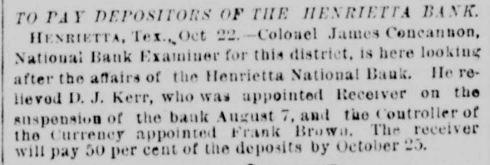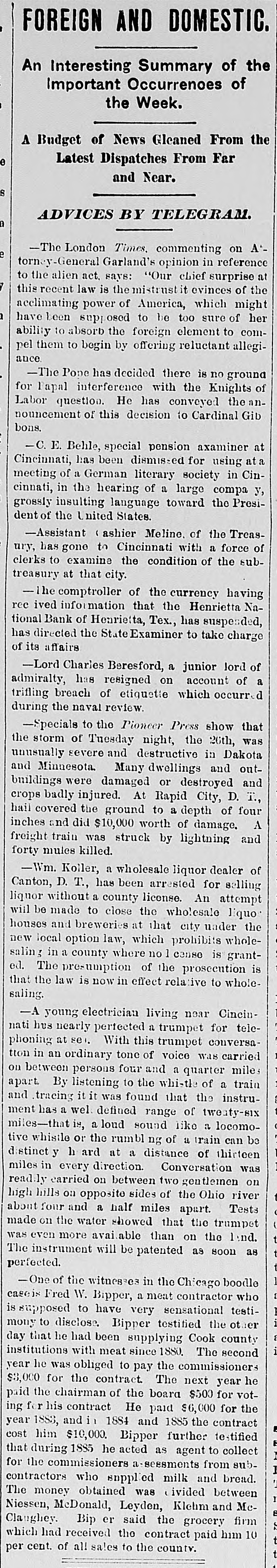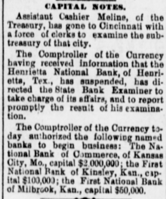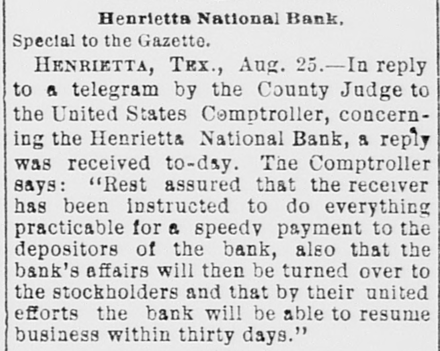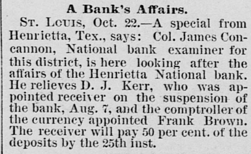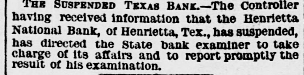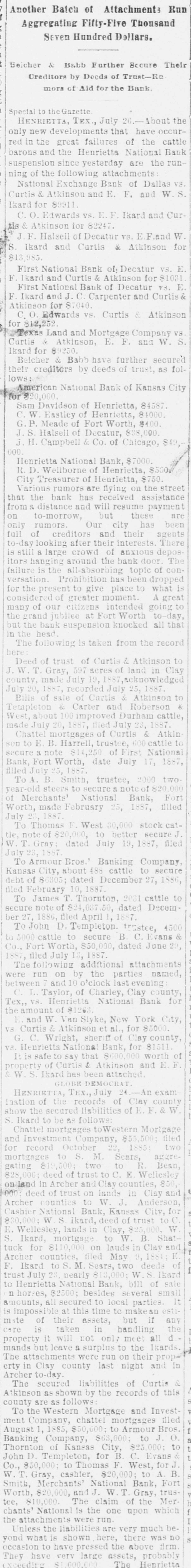 The Henrietta (Tex.) National Bank closed its doors yesterday. No estimate of the extent of the failure can be given. Miss Rebecca Hunter, a prominent lady of Newport, R. I., committed suicide last night by jumping from the cliffs into the harbor. Wallace Phillips, the boy who was shot in the head by the cowboys of Sells's circus, during their recent performance at Clinton, Ia, died yesterday. Mrs. Grace Brotherton Deems and her husband, Dr. Francis M. Deems, the son of the Rev. Dr. Charles S. Deems, of New York, have amicably adjusted their differences. Richard H. Paine, clerk under Paymastor Putnam, at the Portsmouth navy-yard, was arrested last night. charged with the embezzlement of about $3,000 of the paymaster's funds. At Youngstown, O., yesterday, Ebenezer Stanyard, convicted of the murder of Alice Hancox, his sweethart, in March last, was sentenced to be hanged Nov. 18, in the penitentiary at Columbus. C. J. Little. a Breathitt county lumber merchant, was arrested at Louisville last night, at the instance of Marion Childers, an Indiana contractor, who charges that Little made way with $1,500 worth of county bonds that he gave him to sell. James Gorham and Mrs. James Dewey. of Springfield. Mass., were arrested by the Clevoland police yesterday, at the instance of Mrs. Gorham, who charges that the couple eloped from Springfield last Wednesday. Gorham was an engineer on the Boston & Albany railroad and Mrs. Dewey is the wife of a Springfield carpenter. The Colby mine safe, at Bessemer, Mich., was robbed of $4,000 on Saturday night. The burglars gained admission by the office windows. Saturday was pay-day, and over $30,000 was distributed. There is generaliy about $10,000 in the safe after pay-day, as some men don't get their wages until Monday. There is no clew to the robbers. Oliver and Elmer Brumbaugh. cousins, aged twenty and twenty-two, respectively, the sons of wealthy farmers living near Congress lake, Ohio, were drowned, Sunday afternoon, while bathing in the lake. Neither could swim, and they jumped from a boat into ten feet of water. A companion in the boat tried to save them, but failed. Jameson, the steeple-chase jockev, who was hurt by the falling of the Canadian horse Willie W. in a race at the West-side track, Chicago, on Saturday, is in a dying condition. Until yesterday it was supposed that he was but slightly injured, but the fact is that his skull was fractured, and a surgical operation yesterday afternoon only served to leave him unconscious. Giles Smith, of Deerfield, N. Y., lost three cows last Wednesday by bloody murrain. Ho had them buried near a running stream, which infected the water. Three cows belonging to Wm. Budlong, jr., a neighbor, died of the disease. Budlong and John Raymond, while looking for the cause, were stung by mosquitoes, and are now seriously ill, having been inoculated with the murrain virus. There is considerable excitement and indignation about the matter. The stream runs through several large farms of imported cattle. Mrs. Joseph Dewitt, a wealthy lady of Wichita, Kan., was probably fatally stabbed, about 9 o'clock last night, by her step-daughter, Mollie Bennett. of Hot Springs. Ark. Miss Bennet is a daughter of Dewitt by his first wife, and upon her coming to Wichita Mrs. Dewitt refused her admission to the house. Last evening, Miss Bennett, accompanied by a young man, drove up to the house, and upon Mrs. Dewitt coming to the door, drew a knife and stabbed her twenty times in the breast, face, neck and arms. She will probably die. The assailant had not been arrested at last accounts.