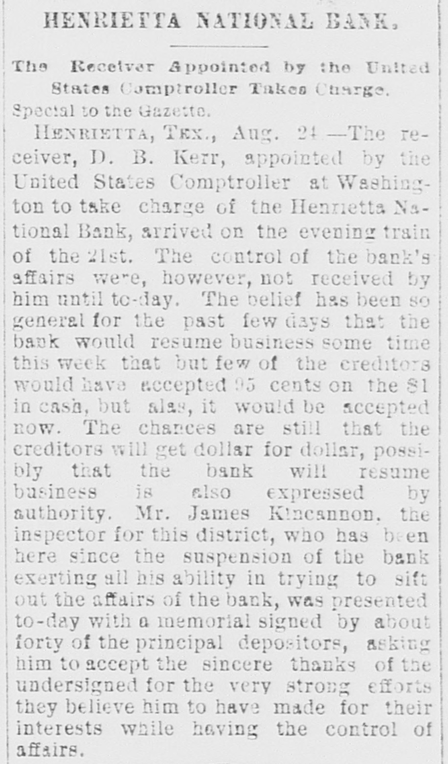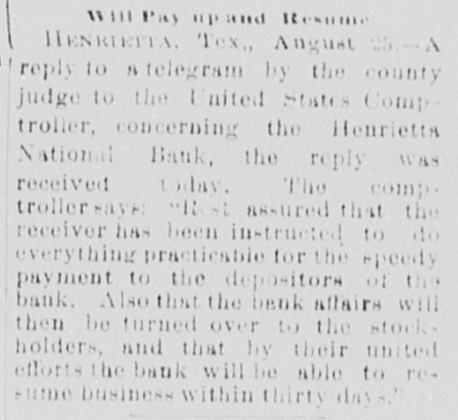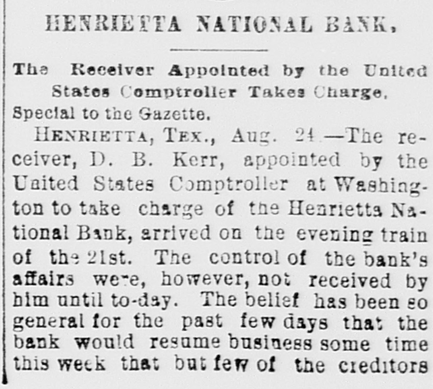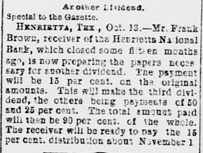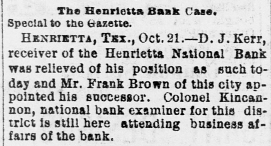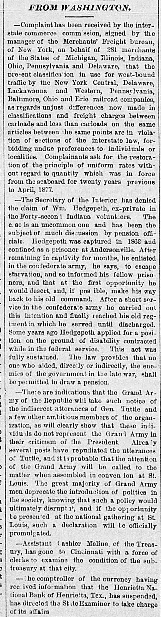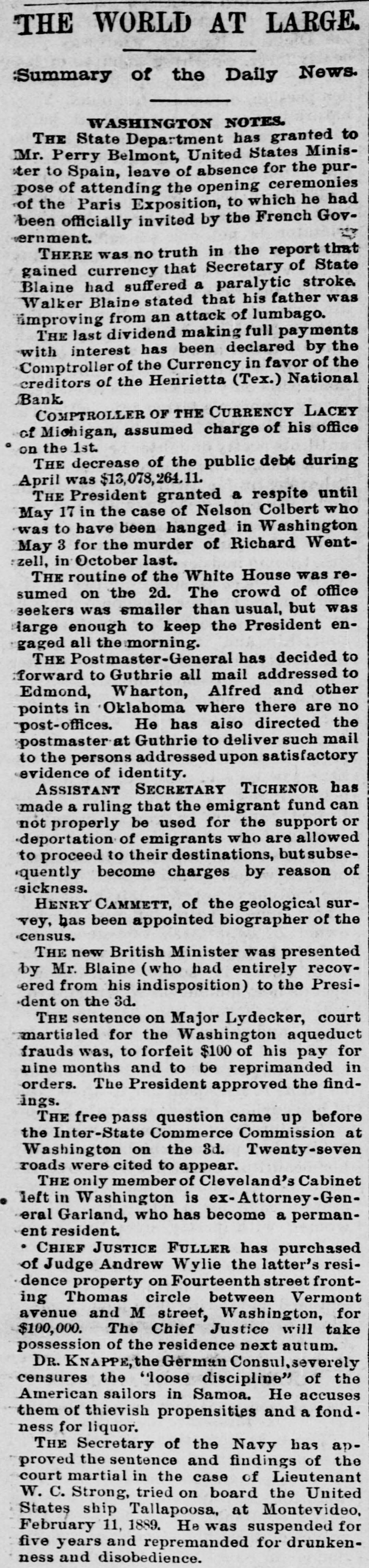 The Henrietta (Tex.) National Bank closed its doors yesterday. No estimate of the extent of the failure can be given. Miss Rebecca Hunter, a prominent lady of Newport, R. I., committed suicide last night by jumping from the cliffs into the harbor. Wallace Phillips, the boy who was shot in the head by the cowboys of Sells's circus, during their recent performance at Clinton, Ia, died yesterday. Mrs. Grace Brotherton Deems and her husband, Dr. Francis M. Deems, the son of the Rev. Dr. Charles S. Deems, of New York, have amicably adjusted their differences. Richard H. Paine, clerk under Paymastor Putnam, at the Portsmouth navy-yard, was arrested last night. charged with the embezzlement of about $3,000 of the paymaster's funds. At Youngstown, O., yesterday, Ebenezer Stanyard, convicted of the murder of Alice Hancox, his sweethart, in March last, was sentenced to be hanged Nov. 18, in the penitentiary at Columbus. C. J. Little. a Breathitt county lumber merchant, was arrested at Louisville last night, at the instance of Marion Childers, an Indiana contractor, who charges that Little made way with $1,500 worth of county bonds that he gave him to sell. James Gorham and Mrs. James Dewey. of Springfield. Mass., were arrested by the Clevoland police yesterday, at the instance of Mrs. Gorham, who charges that the couple eloped from Springfield last Wednesday. Gorham was an engineer on the Boston & Albany railroad and Mrs. Dewey is the wife of a Springfield carpenter. The Colby mine safe, at Bessemer, Mich., was robbed of $4,000 on Saturday night. The burglars gained admission by the office windows. Saturday was pay-day, and over $30,000 was distributed. There is generaliy about $10,000 in the safe after pay-day, as some men don't get their wages until Monday. There is no clew to the robbers. Oliver and Elmer Brumbaugh. cousins, aged twenty and twenty-two, respectively, the sons of wealthy farmers living near Congress lake, Ohio, were drowned, Sunday afternoon, while bathing in the lake. Neither could swim, and they jumped from a boat into ten feet of water. A companion in the boat tried to save them, but failed. Jameson, the steeple-chase jockev, who was hurt by the falling of the Canadian horse Willie W. in a race at the West-side track, Chicago, on Saturday, is in a dying condition. Until yesterday it was supposed that he was but slightly injured, but the fact is that his skull was fractured, and a surgical operation yesterday afternoon only served to leave him unconscious. Giles Smith, of Deerfield, N. Y., lost three cows last Wednesday by bloody murrain. Ho had them buried near a running stream, which infected the water. Three cows belonging to Wm. Budlong, jr., a neighbor, died of the disease. Budlong and John Raymond, while looking for the cause, were stung by mosquitoes, and are now seriously ill, having been inoculated with the murrain virus. There is considerable excitement and indignation about the matter. The stream runs through several large farms of imported cattle. Mrs. Joseph Dewitt, a wealthy lady of Wichita, Kan., was probably fatally stabbed, about 9 o'clock last night, by her step-daughter, Mollie Bennett. of Hot Springs. Ark. Miss Bennet is a daughter of Dewitt by his first wife, and upon her coming to Wichita Mrs. Dewitt refused her admission to the house. Last evening, Miss Bennett, accompanied by a young man, drove up to the house, and upon Mrs. Dewitt coming to the door, drew a knife and stabbed her twenty times in the breast, face, neck and arms. She will probably die. The assailant had not been arrested at last accounts.