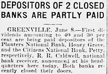 DEPOSITORS OF 2 CLOSED BANKS ARE PARTLY PAID GREENVILLE. June First dividends amounting 40 and 30 cent are being paid of the Planters National Bank. Honey Grove. and the Citizens National Bank. Petty. respectively. R. R. Caldwell national bank at his head quarters here today. Both banks recently closed their doors.