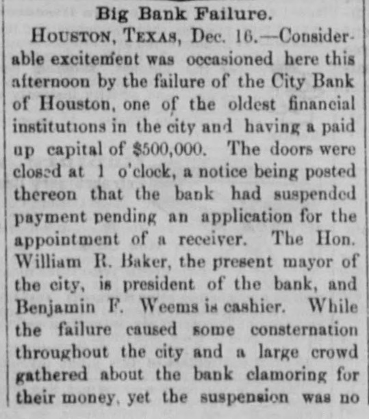 Big Bank Failure. HOUSTON, TEXAS, Dec. 16.-Considerable excitement was occasioned here this afternoon by the failure of the City Bank of Houston, one of the oldest financial institutions in the city and having a paid up capital of $500,000. The doors were closed at 1 o'clock, a notice being posted thereon that the bank had suspended payment pending an application for the appointment of a receiver. The Hon. William R. Baker, the present mayor of the city, is president of the bank, and Benjamin F. Weems is cashier. While the failure caused some consternation throughout the city and a large crowd gathered about the bank clamoring for their money, yet the suspension was no