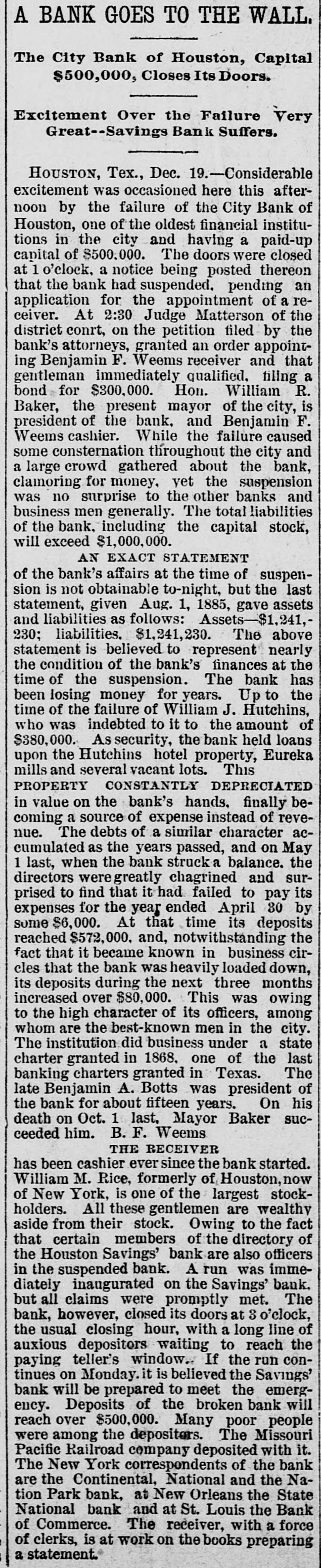 A BANK GOES TO THE WALL. The City Bank of Houston, Capital $500,000, Closes Its Doors. Excitement Over the Failure Very Great--Savings Bank Suffers. HOUSTON, Tex., Dec. 19.-Considerable excitement was occasioned here this afternoon by the failure of the City Bank of Houston, one of the oldest financial institutions in the city and having a paid-up capital of $500.000. The doors were closed at 1 o'clock, a notice being posted thereon that the bank had suspended, pending an application for the appointment of a receiver. At 2:30 Judge Matterson of the district conrt, on the petition filed by the bank's attorneys, granted an order appointing Benjamin F. Weems receiver and that gentleman immediately qualified, filing a bond for $300,000. Hon. William R. Baker, the present mayor of the city, is president of the bank. and Benjamin F. Weems cashier. While the failure caused some consternation throughout the city and a large crowd gathered about the bank, clamoring for money, yet the suspension was no surprise to the other banks and business men generally. The total liabilities of the bank. including the capital stock, will exceed $1,000,000. AN EXACT STATEMENT of the bank's affairs at the time of suspension is not obtainable to-night, but the last statement, given Aug. 1, 1885, gave assets and liabilities as follows: Assets-$1,241,230; liabilities. $1,241,230. The above statement is believed to represent nearly the condition of the bank's finances at the time of the suspension. The bank has been losing money for years. Up to the time of the failure of William J. Hutchins, who was indebted to it to the amount of $380,000. As security, the bank held loans upon the Hutchins hotel property, Eureka mills and several vacant lots. This PROPERTY CONSTANTLY DEPRECIATED in value on the bank's hands, finally becoming a source of expense instead of revenue. The debts of a similar character accumulated as the years passed, and on May 1 last, when the bank struck a balance. the directors were greatly chagrined and surprised to find that it had failed to pay its expenses for the year ended April 30 by some $6,000. At that time its deposits reached $572,000. and, notwithstanding the fact that it became known in business circles that the bank was heavily loaded down, its deposits during the next three months increased over $80,000. This was owing to the high character of its officers, among whom are the best-known men in the city. The institution did business under a state charter granted in 1868, one of the last banking charters granted in Texas. The late Benjamin A. Botts was president of the bank for about fifteen years. On his death on Oct. 1 last, Mayor Baker succeeded him. B. F. Weems THE RECEIVER has been cashier ever since the bank started. William M. Rice, formerly of Houston, now of New York, is one of the largest stockholders. All these gentlemen are wealthy aside from their stock. Owing to the fact that certain members of the directory of the Houston Savings' bank are also officers in the suspended bank. A run was immediately inaugurated on the Savings' bank. but all claims were promptly met. The bank, however, closed its doors at 3 o'clock, the usual closing hour, with a long line of auxious depositors waiting to reach the paying teller's window.. If the run continues on Monday. it is believed the Savings' bank will be prepared to meet the emergency. Deposits of the broken bank will reach over $500,000. Many poor people were among the depositors. The Missouri Pacific Railroad company deposited with it. The New York correspondents of the bank are the Continental, National and the Nation Park bank, at New Orleans the State National bank and at St. Louis the Bank of Commerce. The receiver, with a force of clerks, is at work on the books preparing a statement.