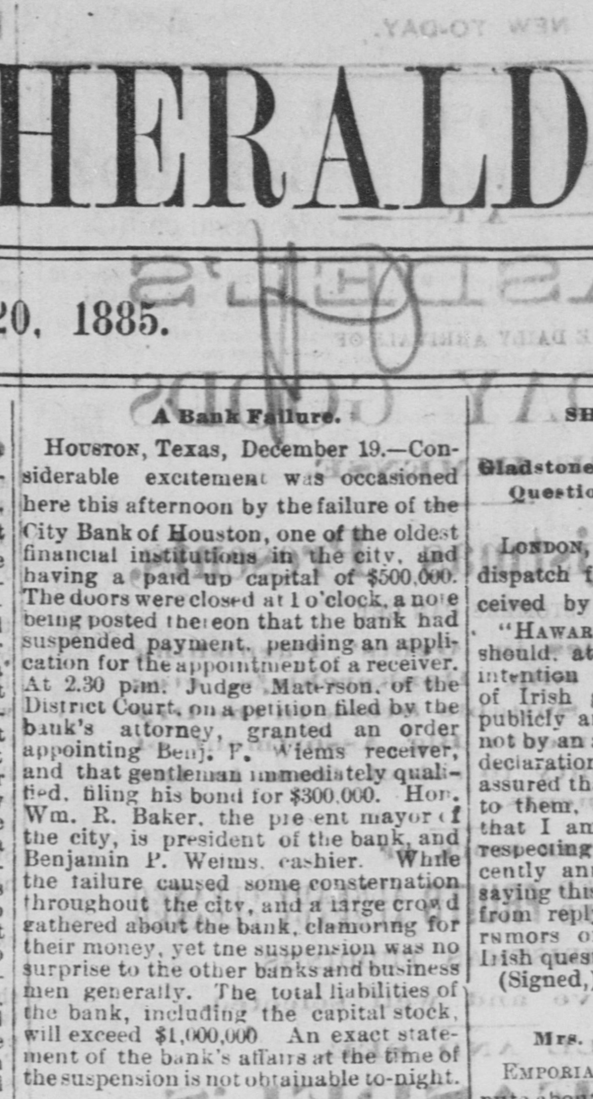 YAG-OT W30 HERALD 1885. X SH A Bank Failure. HOUSTON, Texas, December 19.-ConGladstone siderable excitement was occasioned Questic here this afternoon by the failure of the City Bank of Houston, one of the oldest LONDON, financial institutions in the city, and dispatch f having a paid up capital of $500,000. The doors were closed at 1 o'clock, a note ceived by being posted thereon that the bank had "Hawar suspended payment. pending an applishould. at cation for the appointmentof a receiver. intention At 2.30 p.m. Judge Materson. of the of Irish a District Court, on a petition filed by the publicly a bank's attorney, granted an order not by an # appointing Benj. F. Wiems receiver, declaration and that gentleman immediately qualiassured th tied. filing his bond for $300,000. Hon. to them, Wm. R. Baker. the pie ent mayor 1 that I an the city, is president of the bank, and respecting Benjamin P. Weims. cashier. While cently an the failure caused some consternation saying this throughout the citv, and a large сгои d from repli gathered about the bank, clamoring for rumors o their money, yet the suspension was no Irish quest surprise to the other banks and business (Signed, men generally. The total liabilities of the bank, including the capital stock, will exceed $1,000,000 An exact stateMrs. ment of the bank's affairs at the time of EMPORIA the suspension is not obtainable to-night. hours
