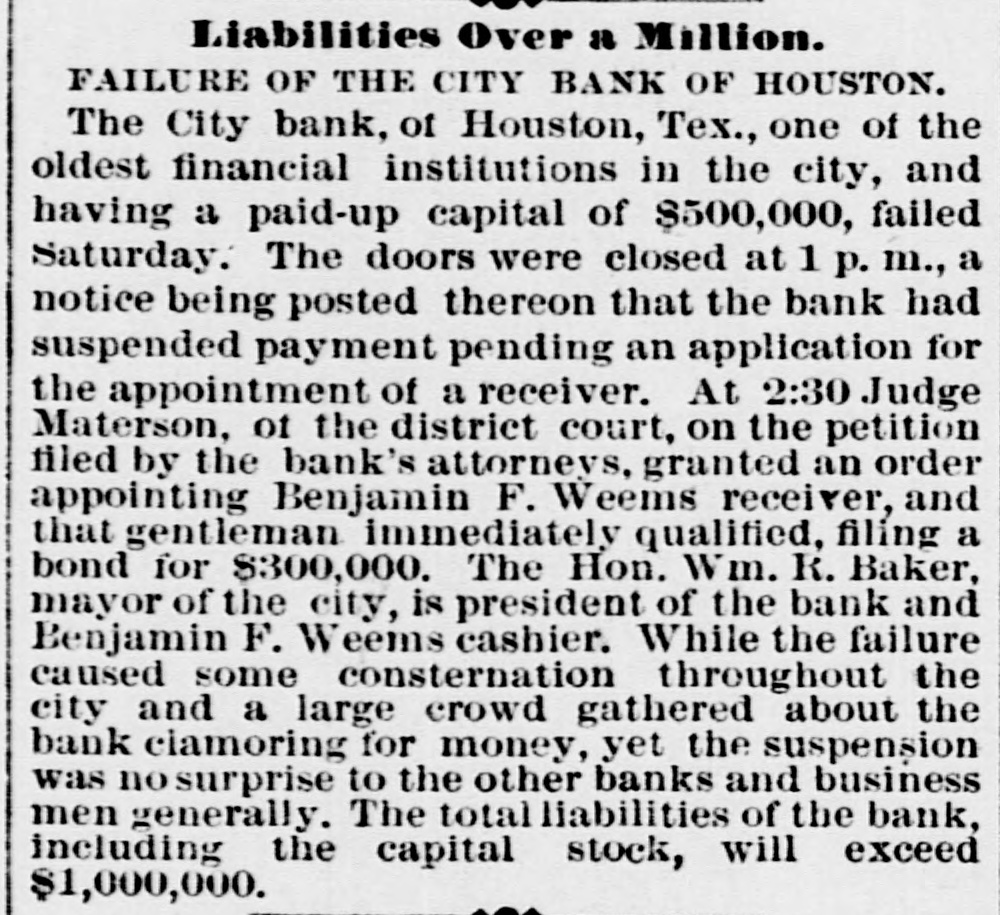 Liabilities Over a Million. FAILURE OF THE CITY BANK OF HOUSTON. The City bank, of Houston, Tex., one of the oldest financial institutions in the city, and having a paid-up capital of $500,000, failed Saturday. The doors were closed at 1 p. m., a notice being posted thereon that the bank had suspended payment pending an application for the appointment of a receiver. At 2:30 Judge Materson, of the district court, on the petition filed by the bank's attorneys, granted an order appointing Benjamin F. Weems receiver, and that gentleman immediately qualified, filing a bond for $300,000. The Hon. Wm. R. Baker, mayor of the city, is president of the bank and Benjamin F. Weems cashier. While the failure caused some consternation throughout the city and a large crowd gathered about the bank clamoring for money, yet the suspension was no surprise to the other banks and business men generally. The total liabilities of the bank, including the capital stock, will exceed $1,000,000.
