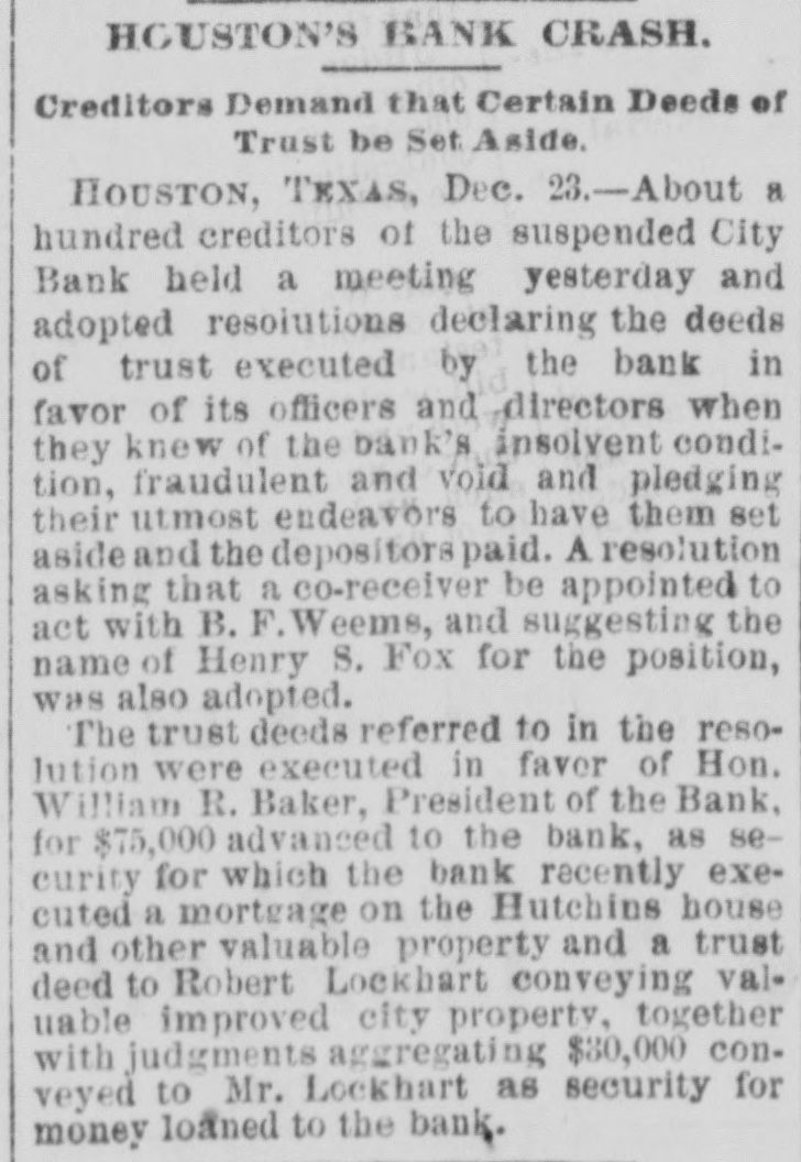 HOUSTON'S BANK CRASH. Creditors Demand that Certain Deeds of Trust be Set Aside. HOUSTON, TEXAS, Dec. 23.-About a hundred creditors of the suspended City Bank held a meeting yesterday and adopted resolutions declaring the deeds of trust executed by the bank in favor of its officers and directors when they knew of the bank's insolvent condition, fraudulent and void and pledging their utmost endeavors to have them set aside and the depositors paid. A resolution asking that a co-receiver be appointed to act with B. F. Weems, and suggesting the name of Henry S. Fox for the position, was also adopted. The trust deeds referred to in the resolution were executed in faver of Hon. William R. Baker, President of the Bank, for $75,000 advanced to the bank, as security for which the bank recently executed a mortgage on the Hutchins house and other valuable property and a trust deed to Robert Lockhart conveying valuable improved city property, together with judgments aggregating $30,000 conveyed to Mr. Lockhart as security for money loaned to the bank.
