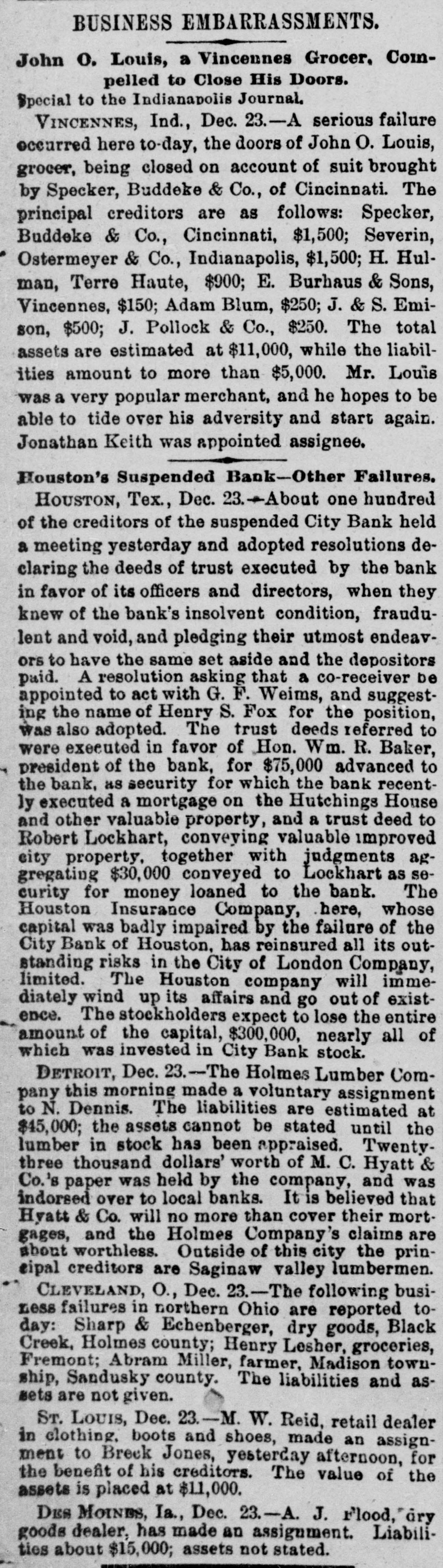 BUSINESS EMBARRASSMENTS. John o. Louis, a Vincennes Grocer. Compelled to Close His Doors. Special to the Indianapolis Journal. VINCENNES, Ind., Dec. 23.-A serious failure occurred here to-day, the doors of John O. Louis, grocer, being closed on account of suit brought by Specker, Buddeke & Co., of Cincinnati. The principal creditors are as follows: Specker, Buddeke & Co., Cincinnati, $1,500; Severin, Ostermeyer & Co., Indianapolis, $1,500; H. Hulman, Terre Haute, $900; E. Burhaus & Sons, Vincennes, $150; Adam Blum, $250; J. & S. Emison, $500; J. Pollock & Co., $250. The total assets are estimated at $11,000, while the liabilities amount to more than $5,000. Mr. Louis was a very popular merchant, and he hopes to be able to tide over his adversity and start again. Jonathan Keith was appointed assignee. Houston's Suspended Bank-Other Failures. HOUSTON, Tex., Dec. 23.-About one hundred of the creditors of the suspended City Bank held a meeting yesterday and adopted resolutions declaring the deeds of trust executed by the bank in favor of its officers and directors, when they knew of the bank's insolvent condition, fraudulent and void, and pledging their utmost endeavors to have the same set aside and the depositors paid. A resolution asking that a co-receiver be appointed to act with G. F. Weims, and suggesting the name of Henry S. Fox for the position, was also adopted. The trust deeds referred to were executed in favor of Hon. Wm. R. Baker, president of the bank, for $75,000 advanced to the bank, as security for which the bank recently executed a mortgage on the Hutchings House and other valuable property, and a trust deed to Robert Lockhart, conveying valuable improved city property, together with judgments aggregating $30,000 conveyed to Lockhart as security for money loaned to the bank. The Houston Insurance Company, here, whose capital was badly impaired by the failure of the City Bank of Houston, has reinsured all its outstanding risks in the City of London Company, limited. The Houston company will immediately wind up its affairs and go out of existence. The stockholders expect to lose the entire amount of the capital, $300,000, nearly all of which was invested in City Bank stock. DETROIT, Dec. 23.-The Holmes Lumber Company this morning made a voluntary assignment to N. Dennis. The liabilities are estimated at $45,000; the assets cannot be stated until the lumber in stock has been appraised. Twentythree thousand dollars' worth of M. C. Hyatt & Co.'s paper was held by the company, and was indorsed over to local banks. It is believed that Hyatt & Co. will no more than cover their mortgages, and the Holmes Company's claims are about worthless. Outside of this city the prineipal creditors are Saginaw valley lumbermen. CLEVELAND, O., Dec. 23.-The following busiLess failures in northern Ohio are reported today: Sharp & Echenberger, dry goods, Black Creek, Holmes county; Henry Lesher, groceries, Fremont; Abram Miller, farmer, Madison township, Sandusky county. The liabilities and assets are not given. ST. LOUIS, Dec. 23.-M. W. Reid, retail dealer in clothing. boots and shoes, made an assignment to Breck Jones, yesterday afternoon, for the benefit of his creditors. The value of the assets is placed at $11,000. DES MOINES, Ia., Dec. 23.-A. J. Flood," dry goods dealer, has made an assignment. Liabilities about $15,000; assets not stated.