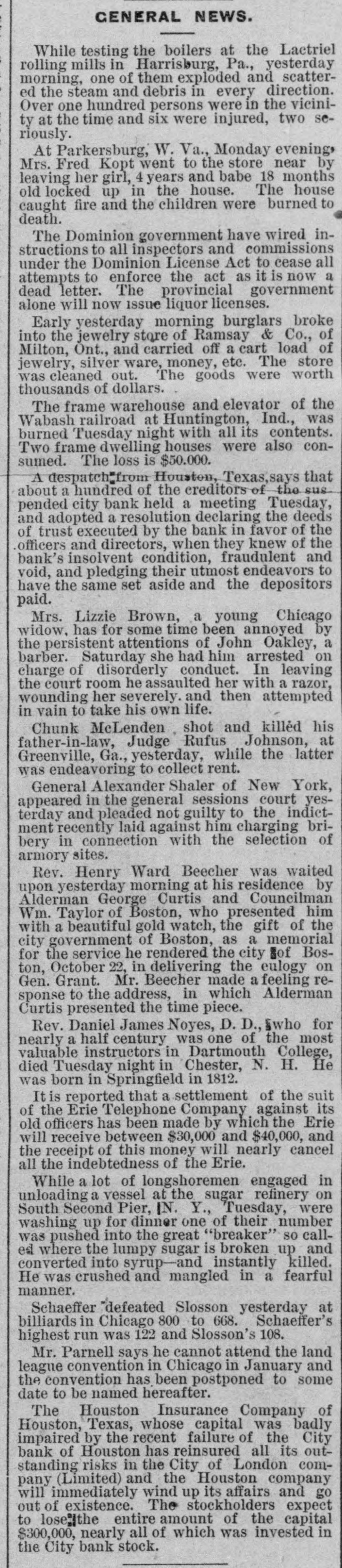 GENERAL NEWS. While testing the boilers at the Lactriel rolling mills in Harrisburg, Pa., yesterday morning, one of them exploded and scattered the steam and debris in every direction. Over one hundred persons were in the vicinity at the time and six were injured, two seriously. At Parkersburg, W. Va., Monday evening Mrs. Fred Kopt went to the store near by leaving her girl, 4 years and babe 18 months old locked up in the house. The house caught fire and the children were burned to death. The Dominion government have wired instractions to all inspectors and commissions under the Dominion License Act to cease all attempts to enforce the act as it is now a dead letter. The provincial government alone will now issue liquor licenses. Early yesterday morning burglars broke into the jewelry store of Ramsay & Co., of Milton, Ont., and carried off a cart load of jewelry, silver ware, money, etc. The store was cleaned out. The goods were worth thousands of dollars. The frame warehouse and elevator of the Wabash railroad at Huntington, Ind., was burned Tuesday night with all its contents. Two frame dwelling houses were also consumed. The loss is $50.000. A despatch"from Houston, Texas. says that about a hundred of the creditors of the sus pended city bank held a meeting Tuesday, and adopted a resolution declaring the deeds of trust executed by the bank in favor of the officers and directors, when they knew of the bank's insolvent condition, fraudulent and void, and pledging their utmost endeavors to have the same set aside and the depositors paid. Mrs. Lizzie Brown, a young Chicago widow, has for some time been annoyed by the persistent attentions of John Oakley, a barber. Saturday she had him arrested on charge of disorderly conduct. In leaving the court room he assaulted her with a razor, wounding her severely. and then attempted in vain to take his own life. Chunk McLenden shot and killed his father-in-law, Judge Rufus Johnson, at Greenville, Ga., yesterday, while the latter was endeavoring to collect rent. General Alexander Shaler of New York, appeared in the general sessions court yesterday and pleaded not guilty to the indictment recently laid against him charging bribery in connection with the selection of armory sites. Rev. Henry Ward Beecher was waited upon yesterday morning at his residence by Alderman George Curtis and Councilman Wm. Taylor of Boston, who presented him with a beautiful gold watch, the gift of the city government of Boston, as a memorial for the service he rendered the city of Boston, October 22, in delivering the eulogy on Gen. Grant. Mr. Beecher made a feeling response to the address, in which Alderman Curtis presented the time piece. Rev. Daniel James Noyes, D. D., who for nearly a half century was one of the most valuable instructors in Dartmouth College, died Tuesday night in Chester, N. H. He was born in Springfield in 1812. It is reported that a settlement of the suit of the Erie Telephone Company against its old officers has been made by which the Erie will receive between $30,000 and $40,000, and the receipt of this money will nearly cancel all the indebtedness of the Erie. While a lot of longshoremen engaged in unloading a vessel at the sugar refinery on South Second Pier, IN. Y., Tuesday, were washing up for dinner one of their number was pushed into the great "breaker" so called where the lumpy sugar is broken up and converted into syrup-and instantly killed. He was crushed and mangled in a fearful manner. Schaeffer defeated Slosson yesterday at billiards in Chicago 800 to 668. Schaeffer's highest run was 122 and Slosson's 108. Mr. Parnell says he cannot attend the land league convention in Chicago in January and the convention has been postponed to some date to be named hereafter. The Houston Insurance Company of Houston, Texas, whose capital was badly impaired by the recent failure of the City bank of Houston has reinsured all its outstanding risks in the City of London company (Limited) and the Houston company will immediately wind up its affairs and go out of existence. The stockholders expect to lose"the entire amount of the capital $300,000, nearly all of which was invested in the City bank stock.