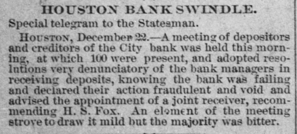 HOUSTON BANK SWINDLE. Special telegram to the Statesman. HOUSTON, December 22. -A meeting of depositors and creditors of the City bank was held this morning, at which 100 were present, and adopted resoIntions very denunciatory of the bank managers in receiving deposits, knowing the bank was failing and declared their action fraudulent and void and advised the appointment of a joint receiver, recommending H. S. Fox. An element of the meeting strove to draw it mild but the majority was bitter.