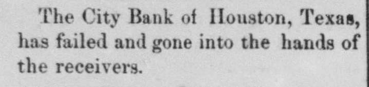 The City Bank of Houston, Texas, has failed and gone into the hands of the receivers.