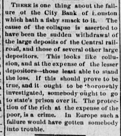 THERE is one thing about the failure of the City Bank of Eouston which bath a fishy smack to it. The cause of the collapse is asserted to have been the sudden withdrawal of the large deposits of the Central railroad, and those of several other large depositors. This looks like collusion, and at the expense of the lesser depositors-those least able to stand the loss, If this should prove to be true, and it ought to be thoroughly investigated, somebody ought to go to state's prison over it. The protection of the rich at the expense of the poor, is a crime. In Europe such a failure would have gotten somebody into trouble.